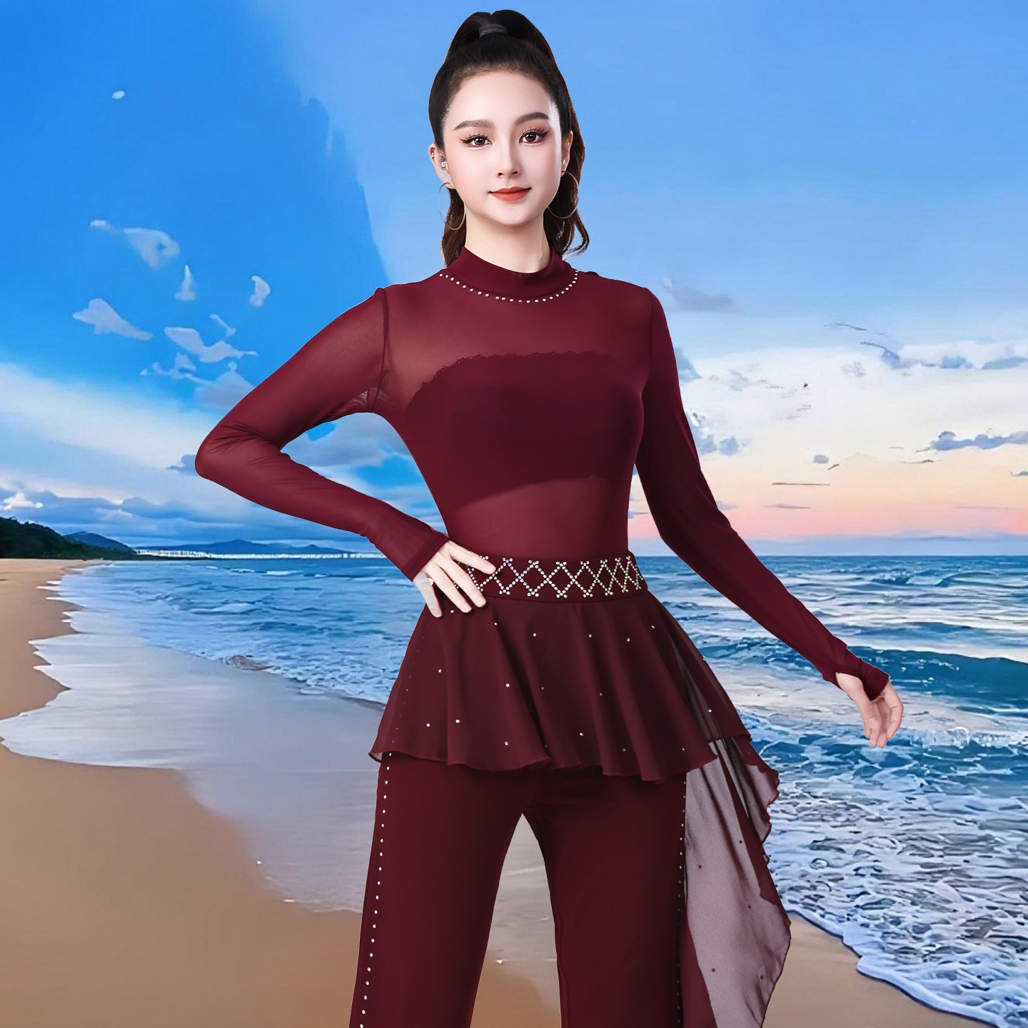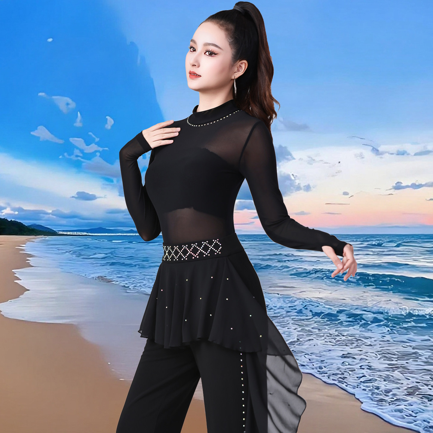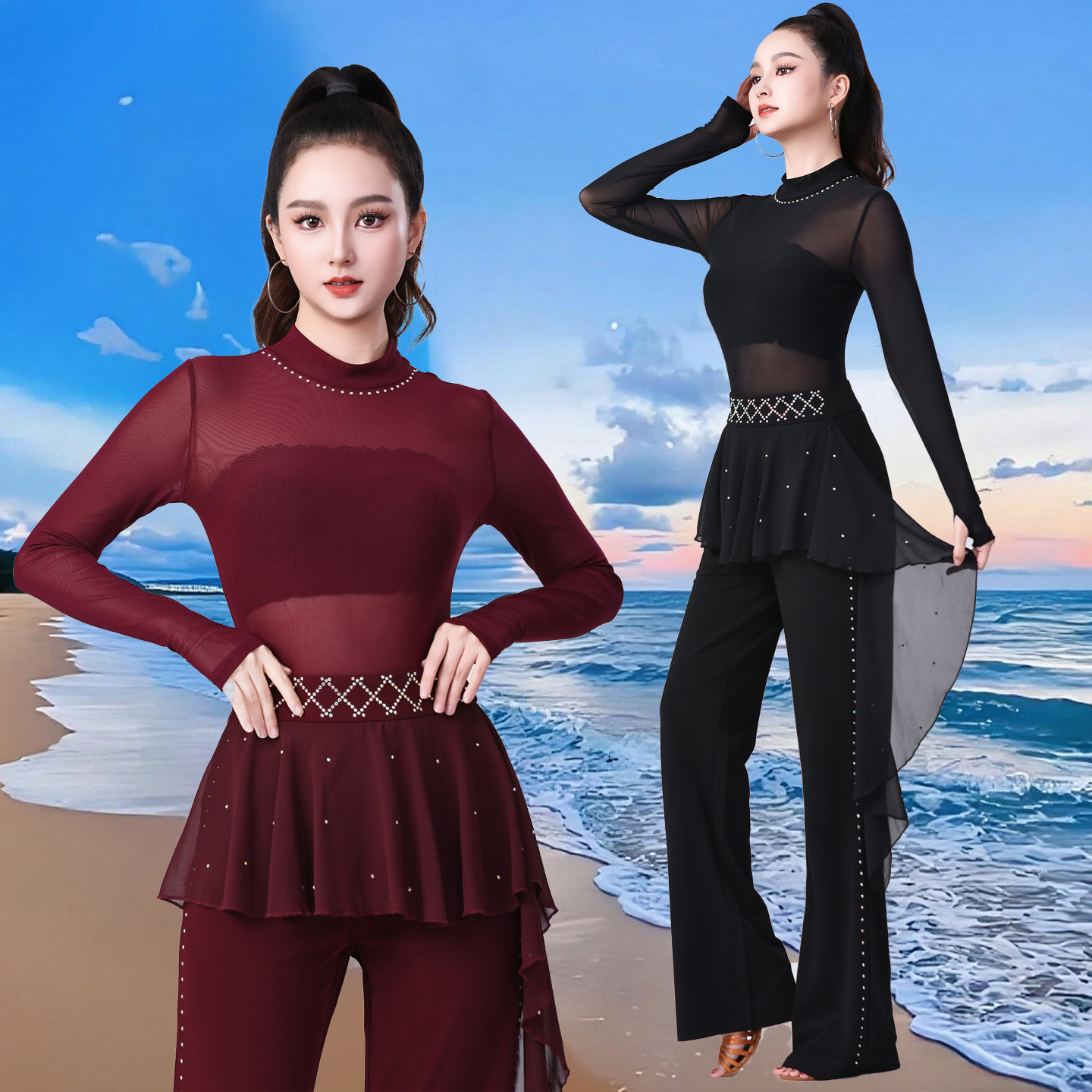 📚 新款吉特巴舞蹈服连裆款广场舞上衣小高领网纱新潮舞服点帕斯服装