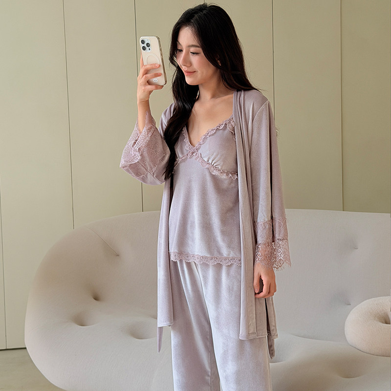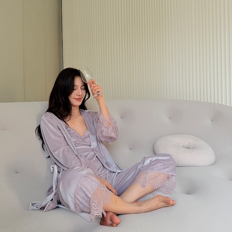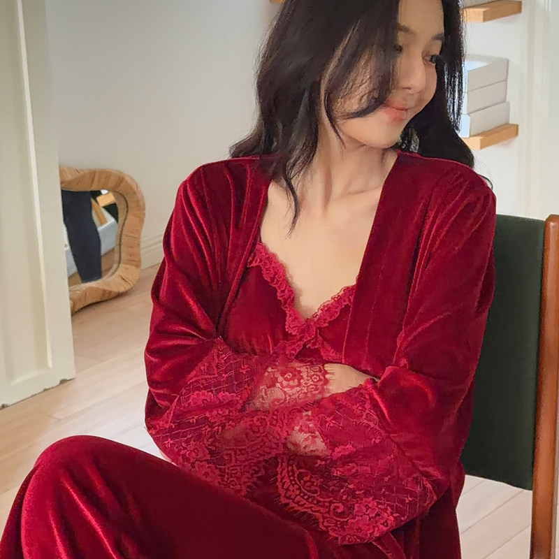 📚 秋冬款红色睡衣丝绒新娘本命年睡袍女秋冬蕾丝边性感家居服睡裙