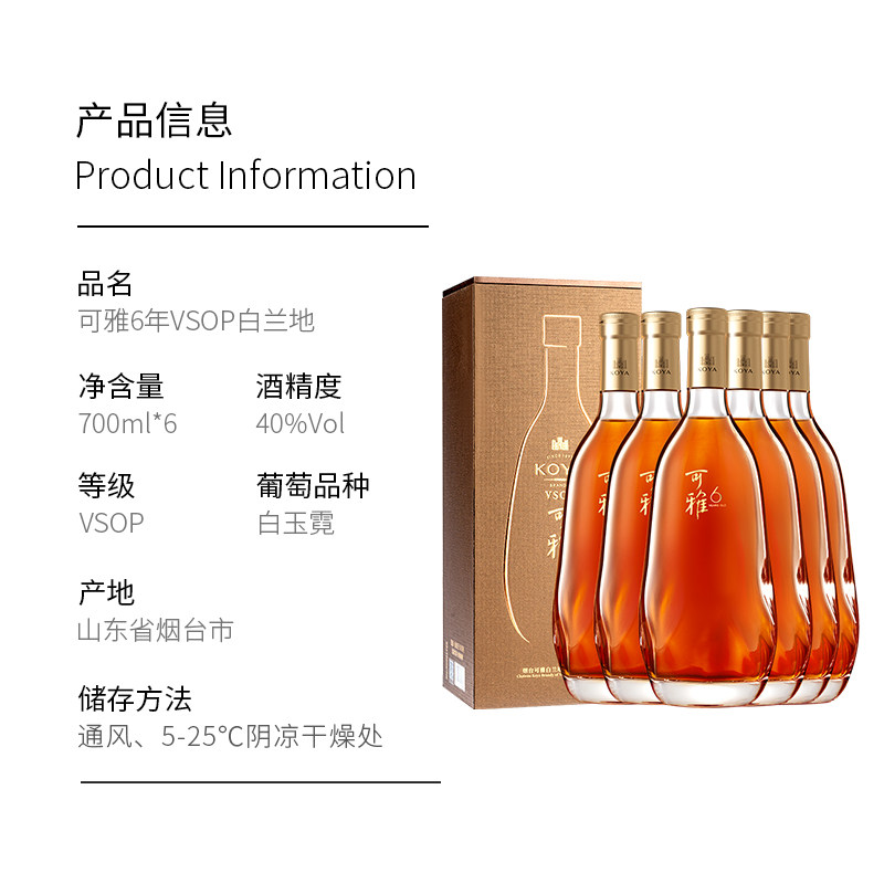 📚 张裕可雅白兰地vsop桶藏六年700ml6支装 洋酒葡萄蒸馏酒