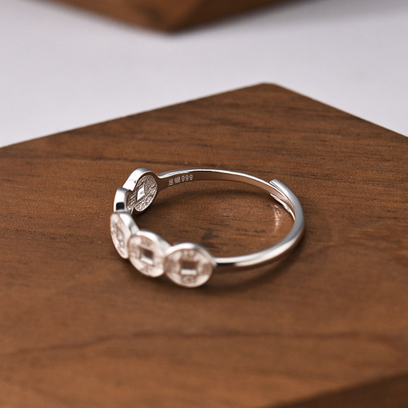 📚 足银999招财铜钱币戒指女纯银五帝钱戒子旺财开口新中式设计指环