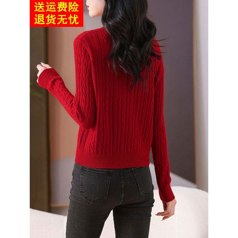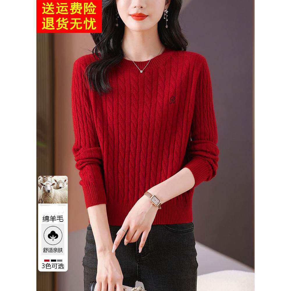 📚 设计感刺绣灰色麻花全羊毛衫女秋冬宽松套头短款打底针织衫毛衣
