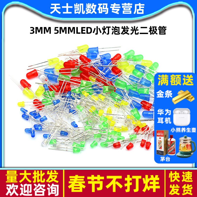 📚 3mm 5mmLED小灯泡发光二极管F3F5红绿黄蓝白色灯珠直插元件包指示