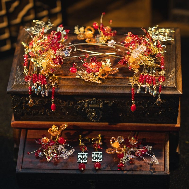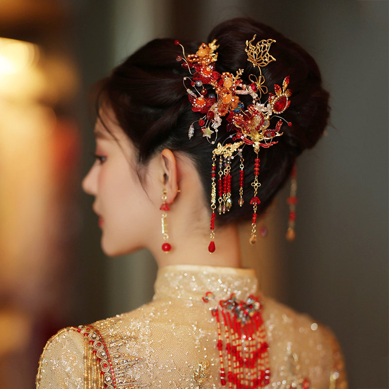 📚 水舞 U1511中式金红色简约花朵新娘秀禾服头饰大气高级龙凤褂发饰