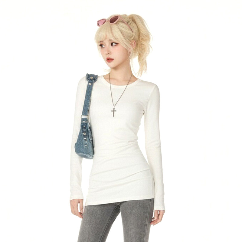 📚 白色内搭中长款遮屁股长袖女t恤修身紧身打底衫上衣白德绒纯棉