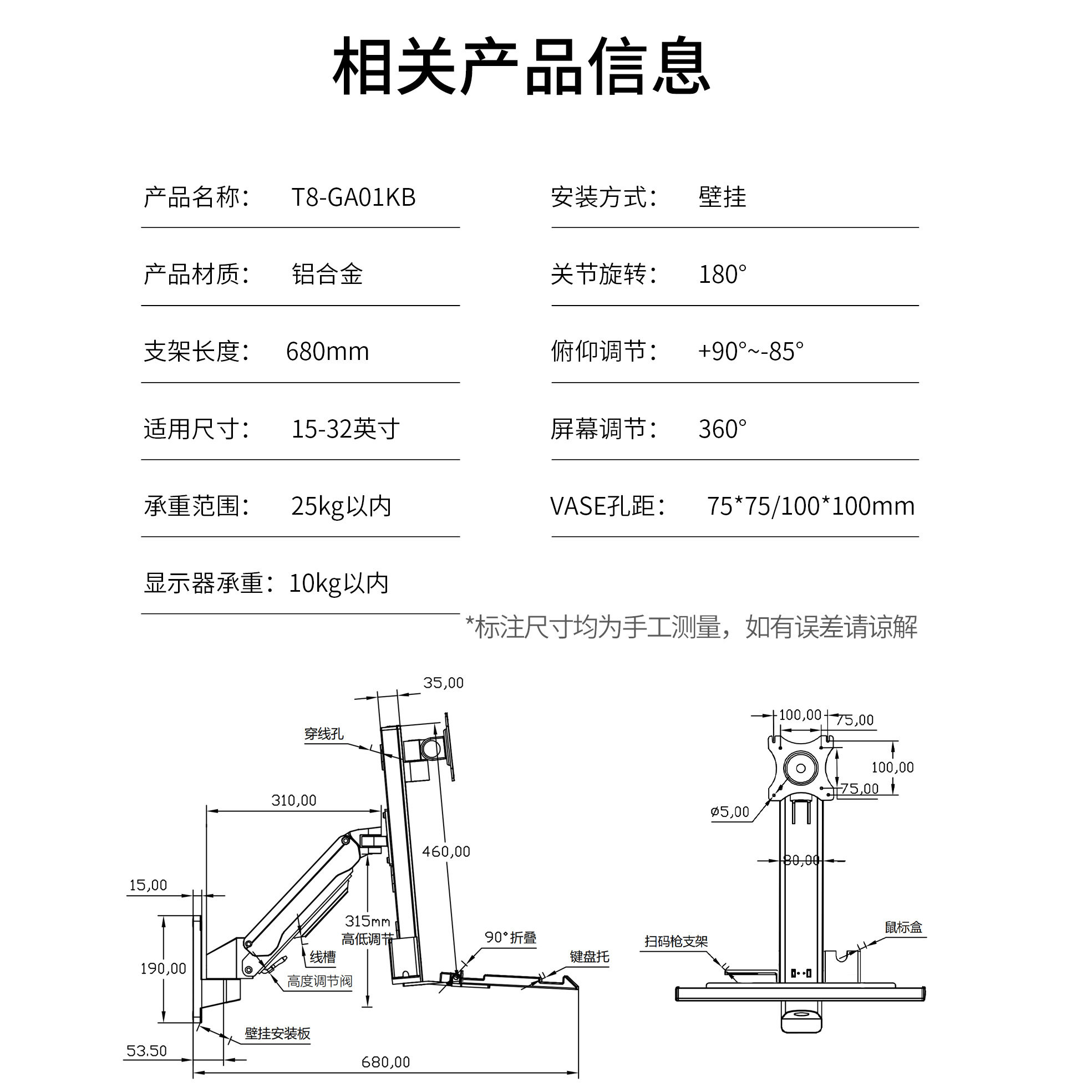📚 壁挂显示器支架20KG工业医疗设备机械臂电脑屏幕支架带键盘托架T8