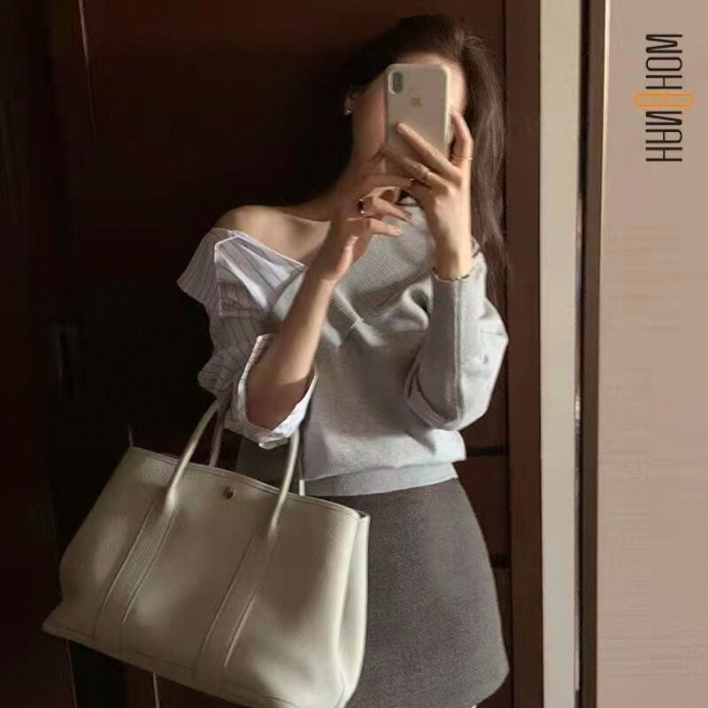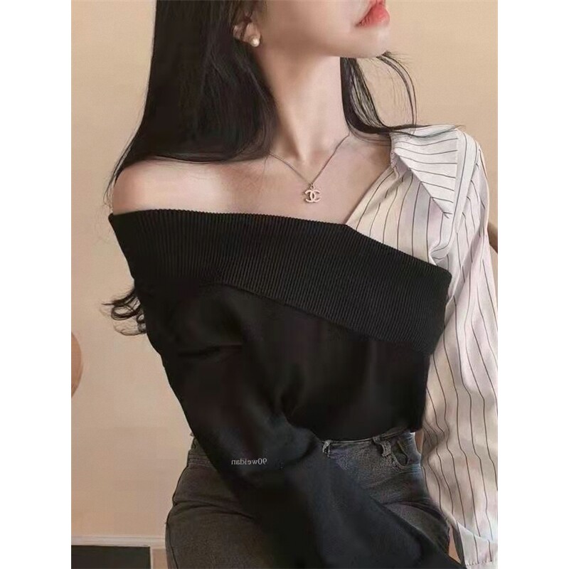 📚 性感条纹拼接撞色假两件针织衫女长袖毛衣仙仙上衣超仙上衣女春秋
