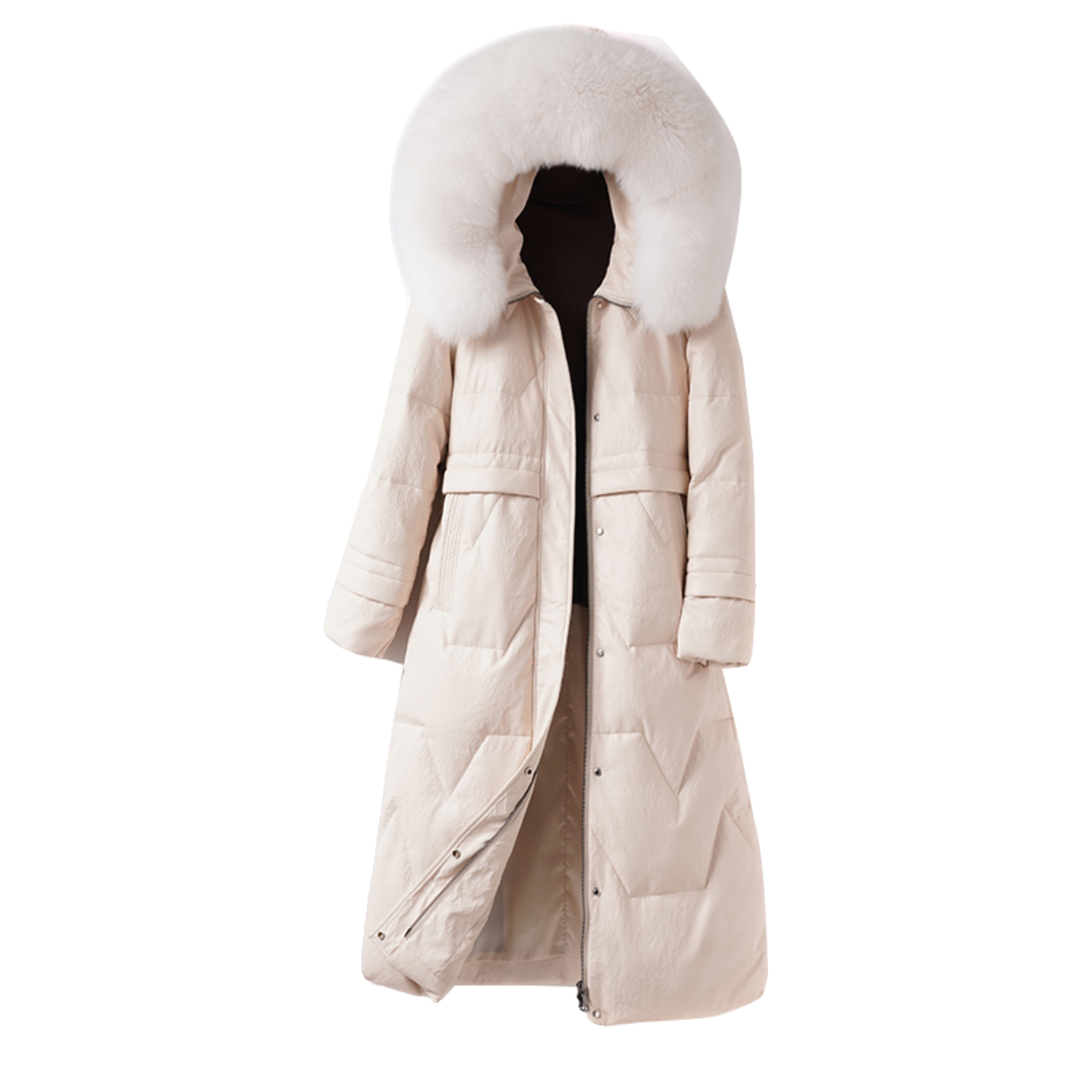 📚 羽绒服女中长款米白色连帽狐狸毛领真皮外套海宁白鸭绒绵羊皮衣