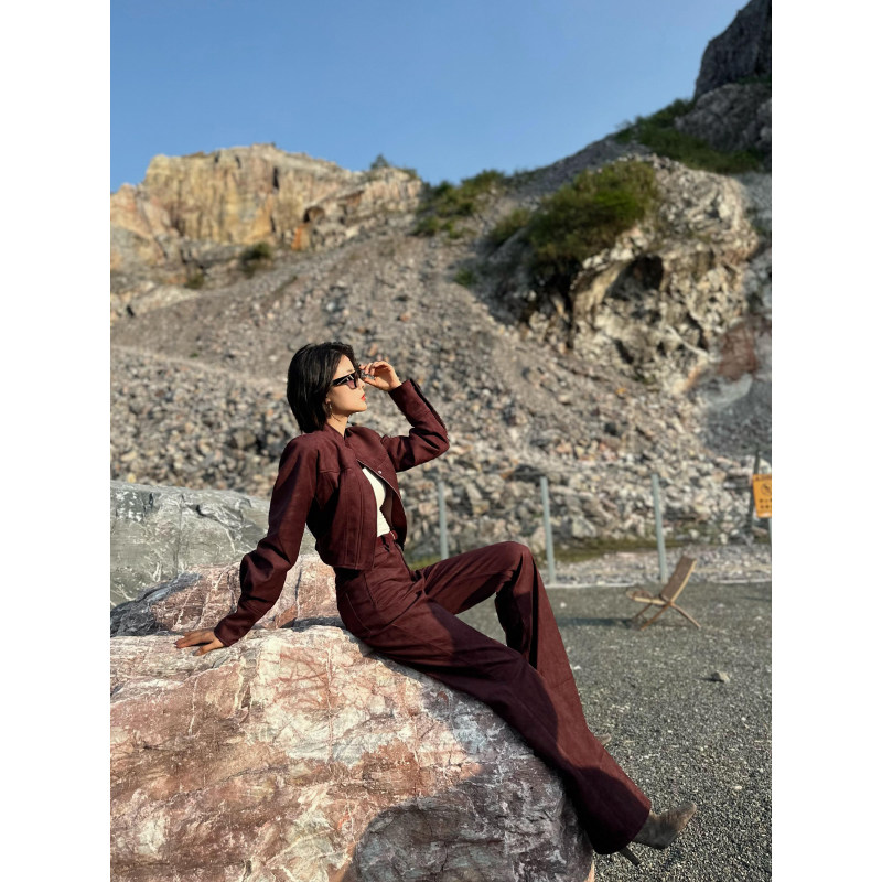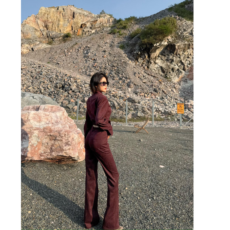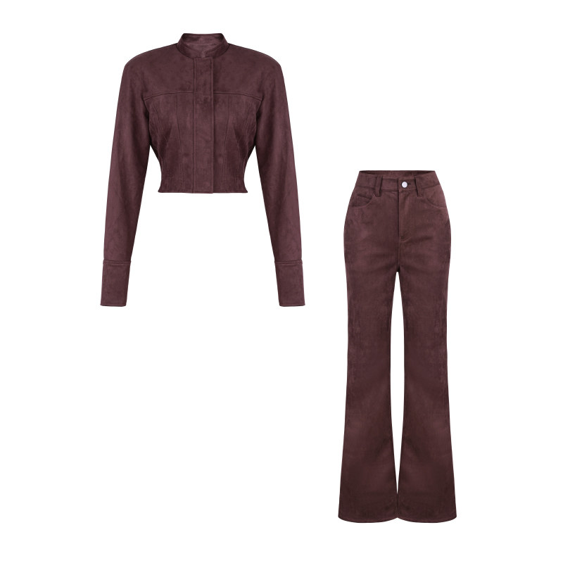 📚 XULU原创秋季新款欧洲进口牛皮绒立领短款小外套高腰微喇阔腿长裤