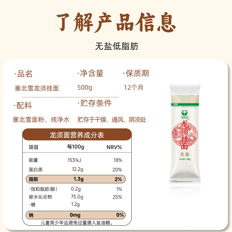 📚 塞北雪挂面无盐龙须面1mm健康绿色食品囤货装劲道爽滑易煮易熟