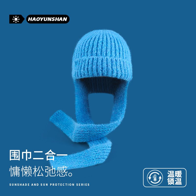 📚 高圆圆同款蓝色针织帽子女韩国新款围巾一体毛线帽冬季保暖护耳帽