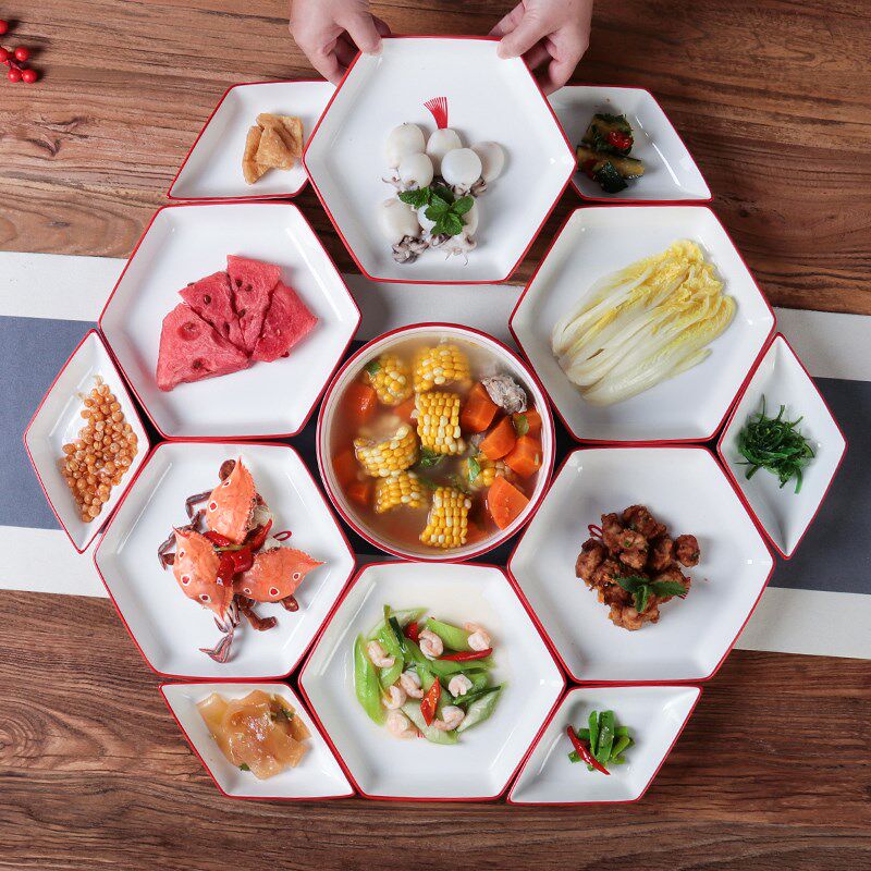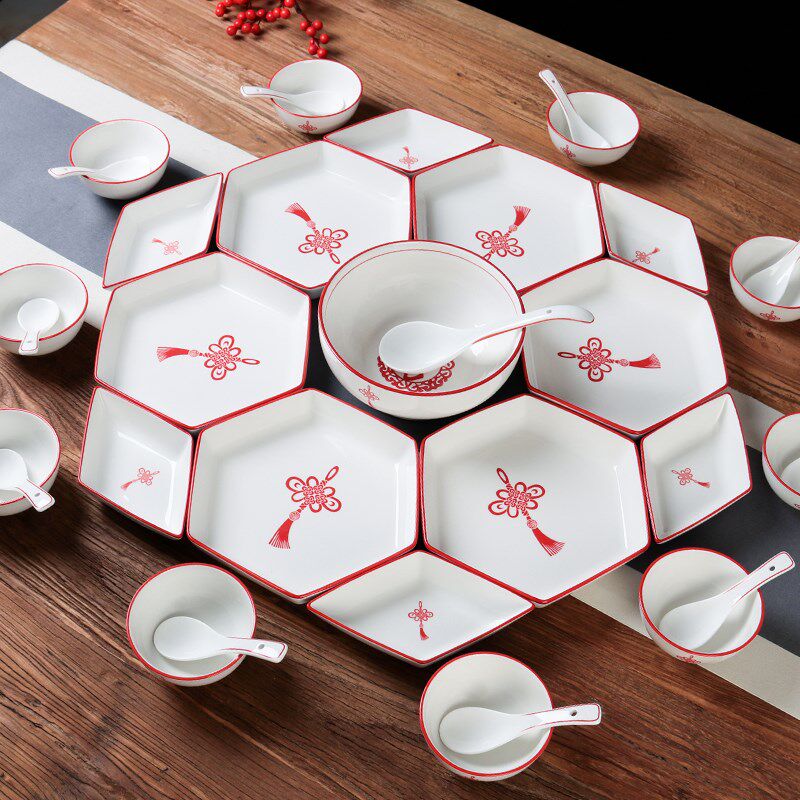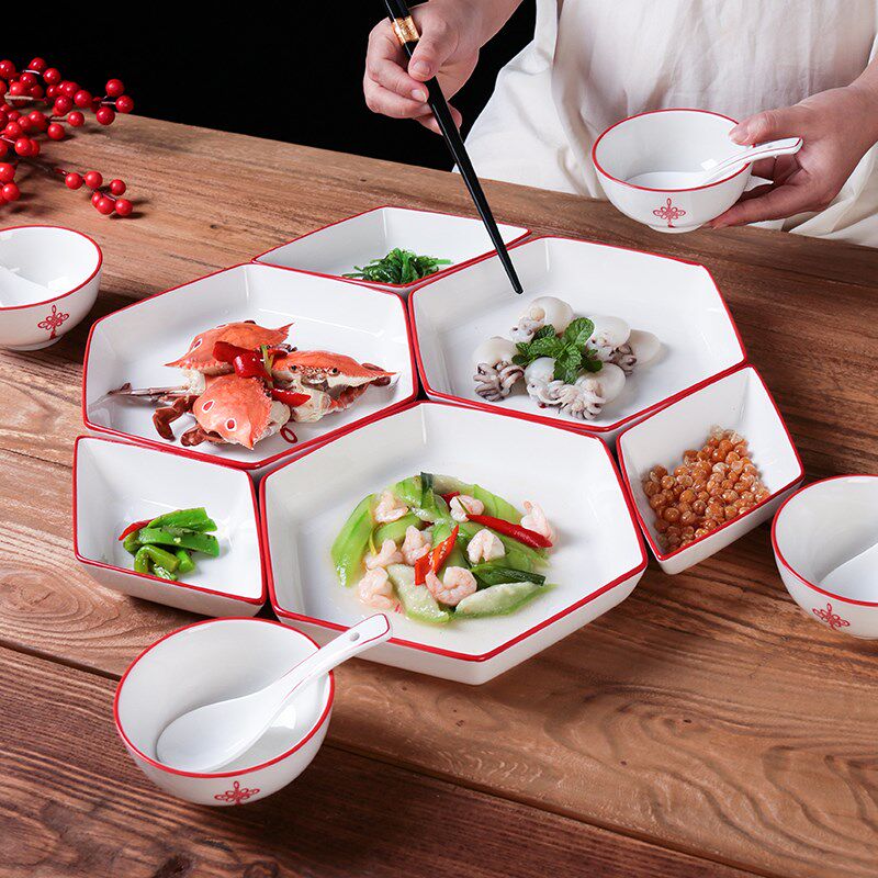 📚 红色喜庆中国结过年家用盘子陶瓷拼盘组合套装网红团圆长方桌餐具