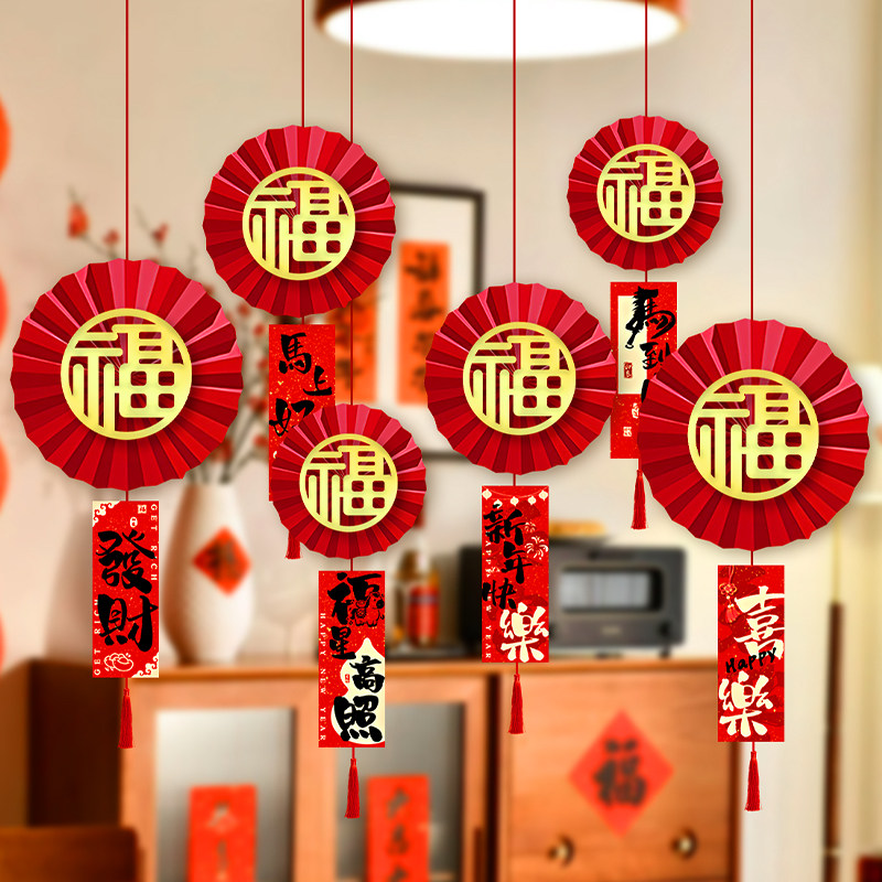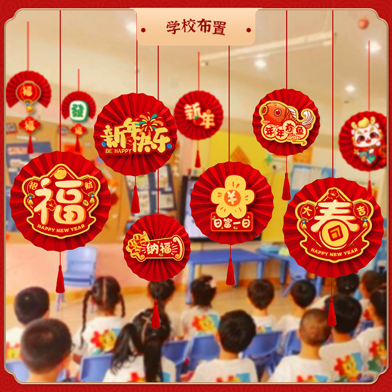 📚 2026马年新年幼儿园教室装饰纸扇挂件会场布置春节拉花福字挂饰