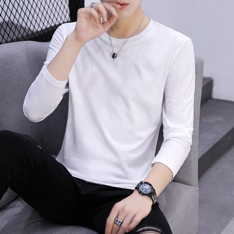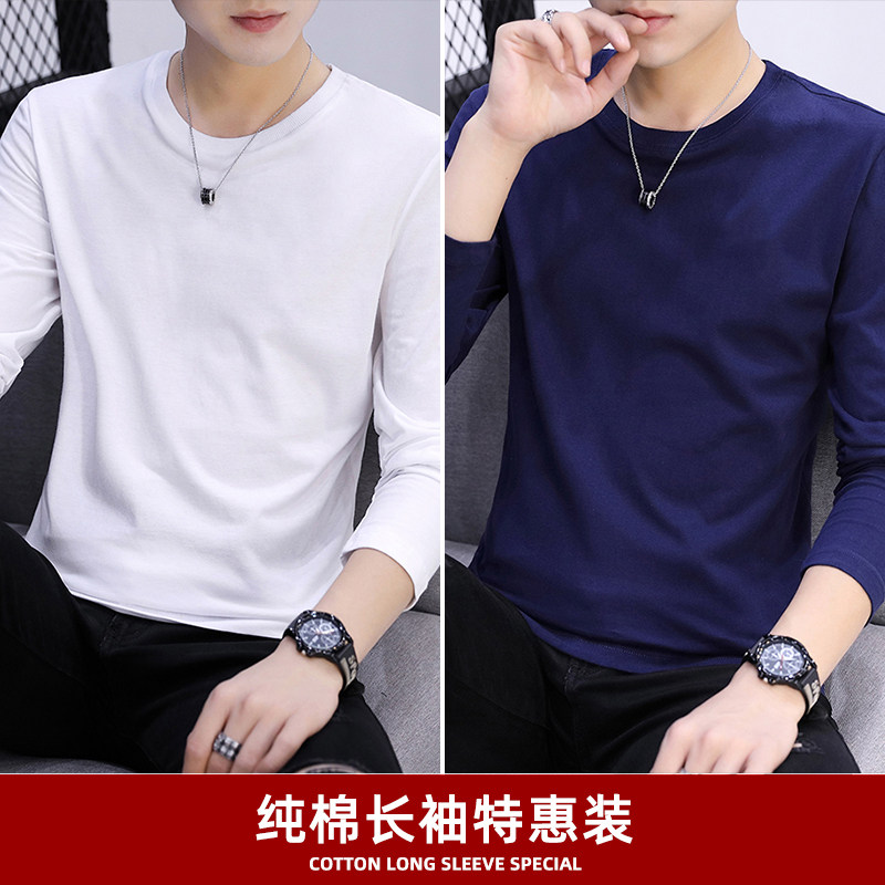 📚 2件】男士长袖t恤男装纯棉衣服纯色潮流春季打底衫白圆领体恤秋衣