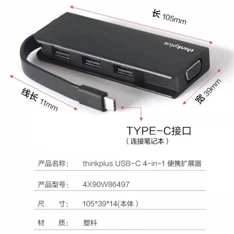 📚 Thinkplus四合一 HUB便携扩展器 Type-c转VGA转换连接线 USB3.0