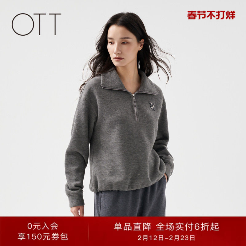 📚 OTT【商场同款】冬季新款灰色半开襟套头卫衣女百搭翻领休闲上衣