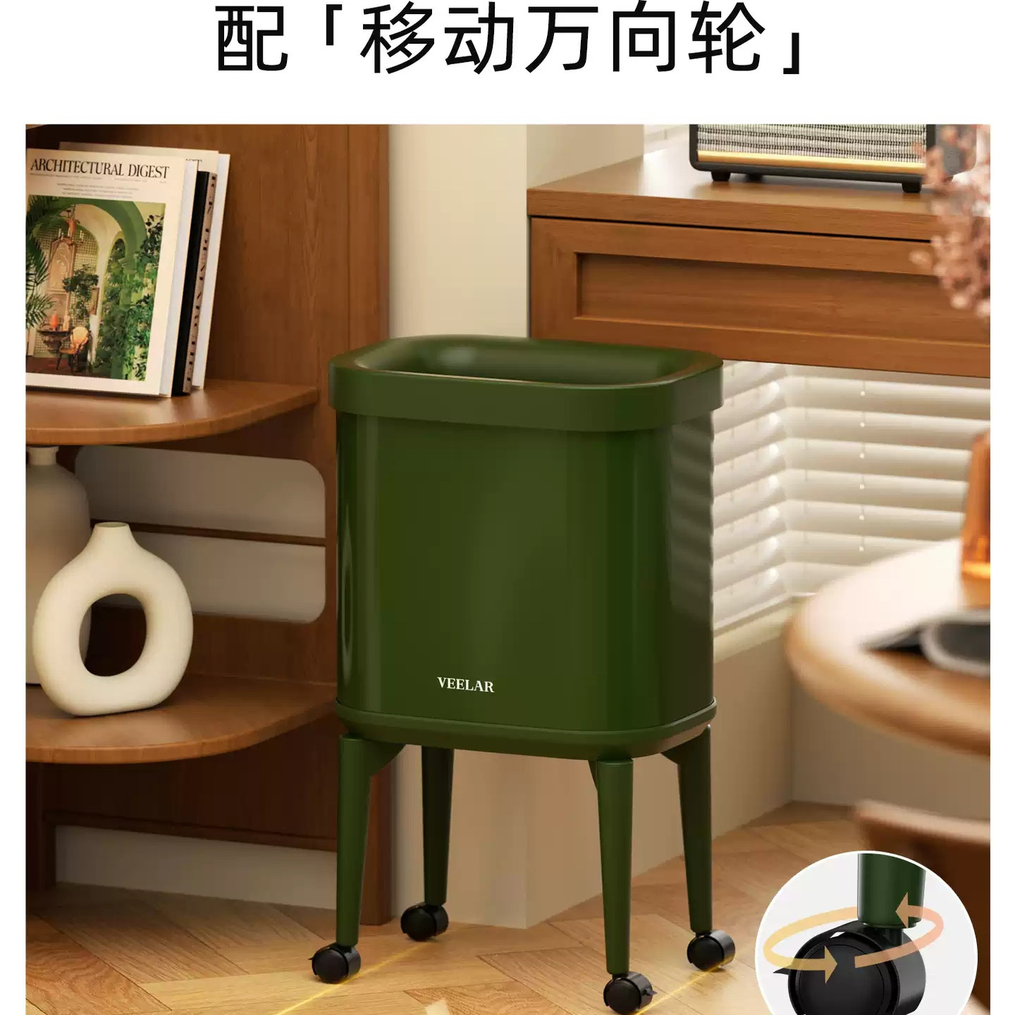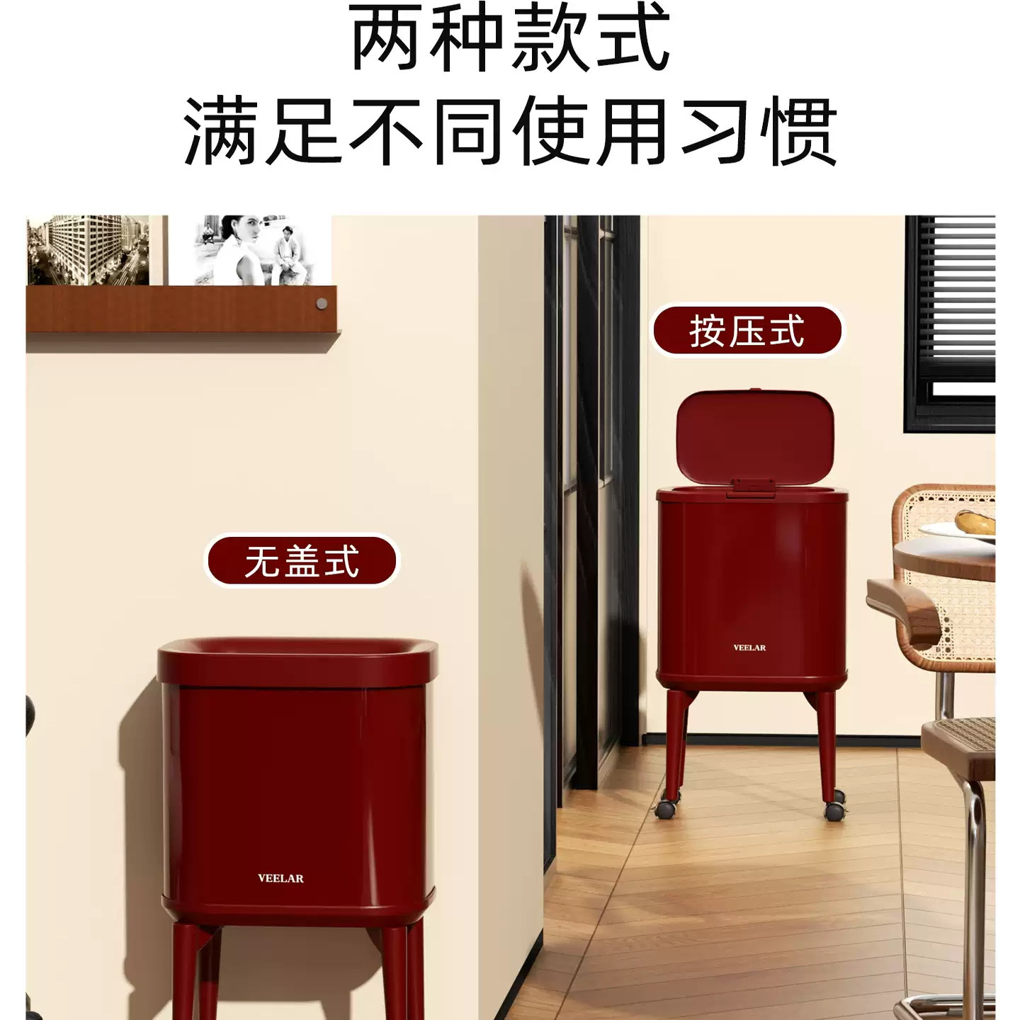 📚 新款垃圾桶高脚带滑轮可移动复古红家用带盖按压式厨房专用大容量