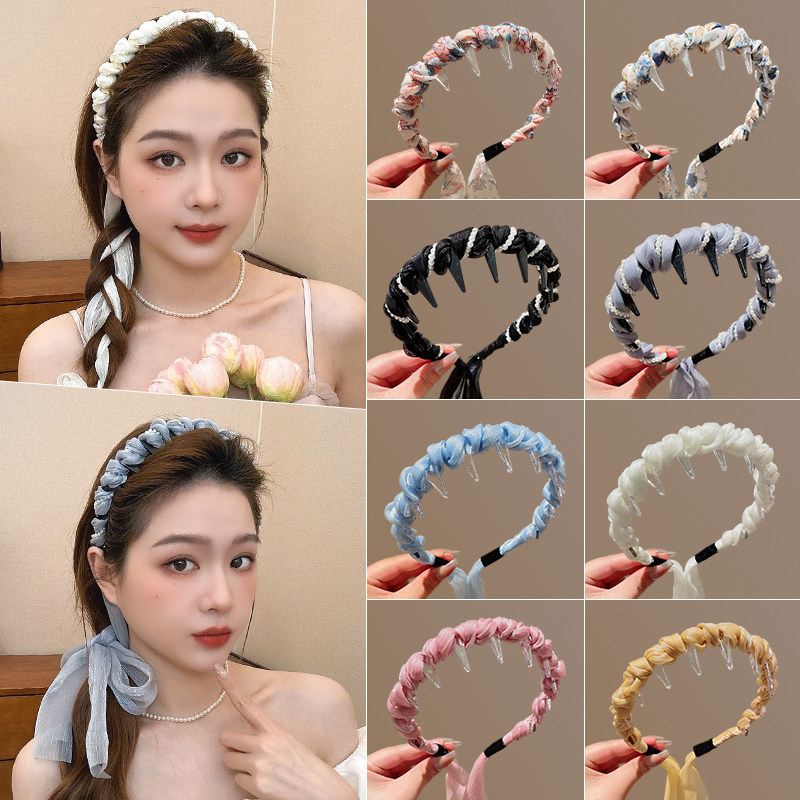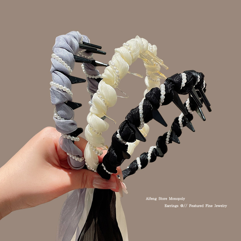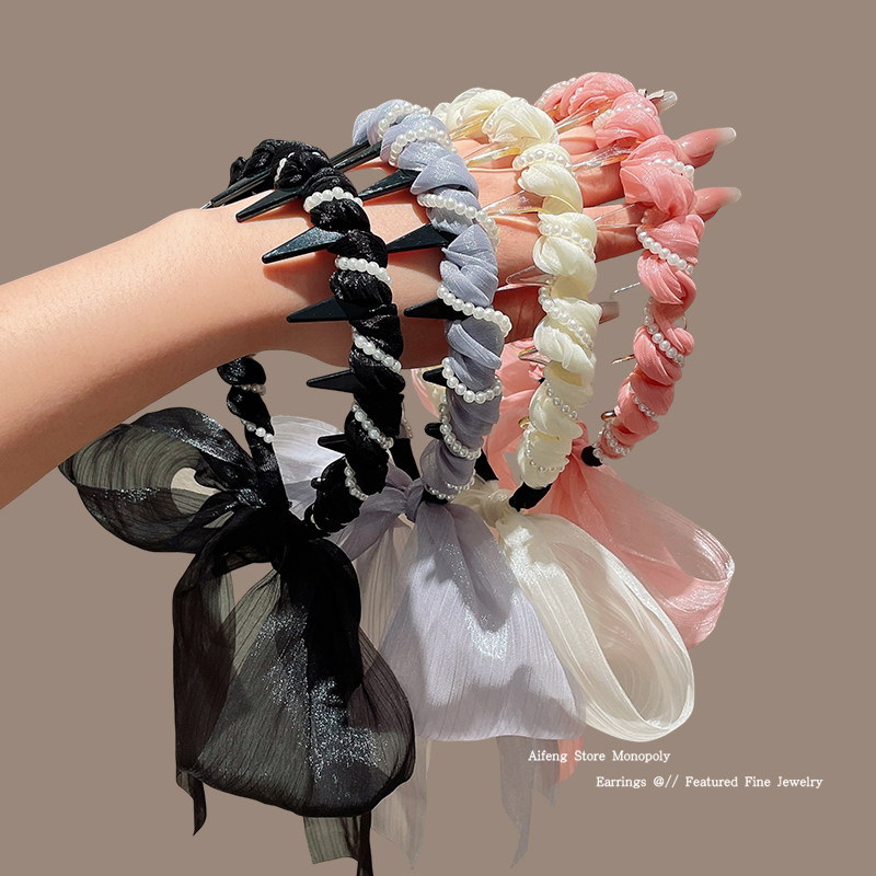 📚 网纱珍珠飘带发箍女款高颅顶发卡编发丝巾一体日常外戴绑发带头饰