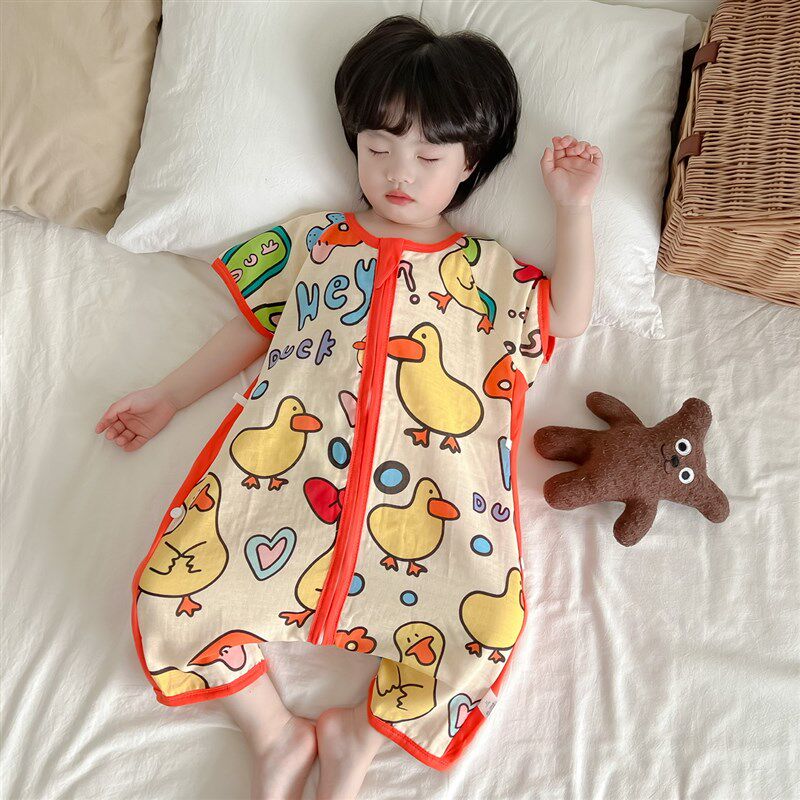 📚 儿童挖掘机睡袋夏季纯棉薄款男童小汽车连体睡衣恐龙防踢被女宝宝