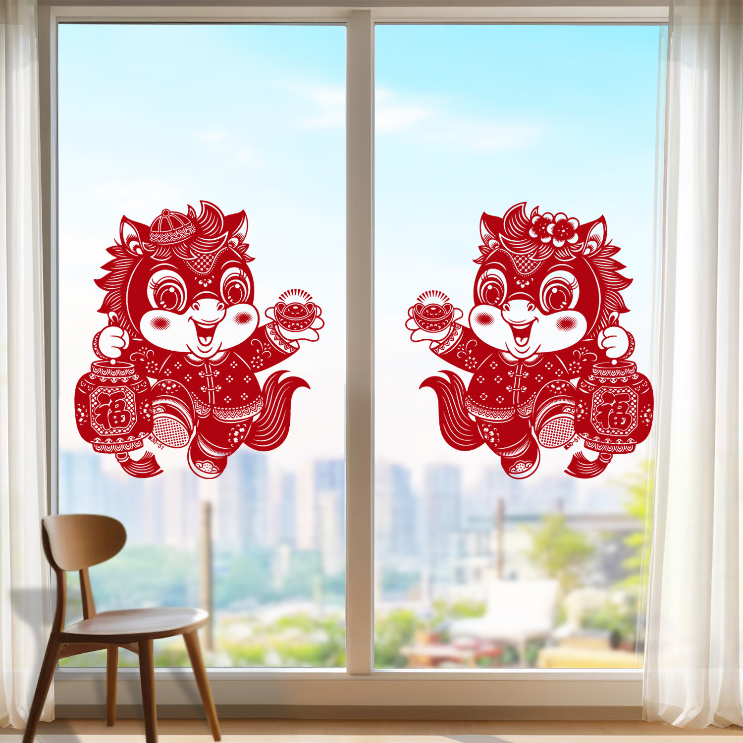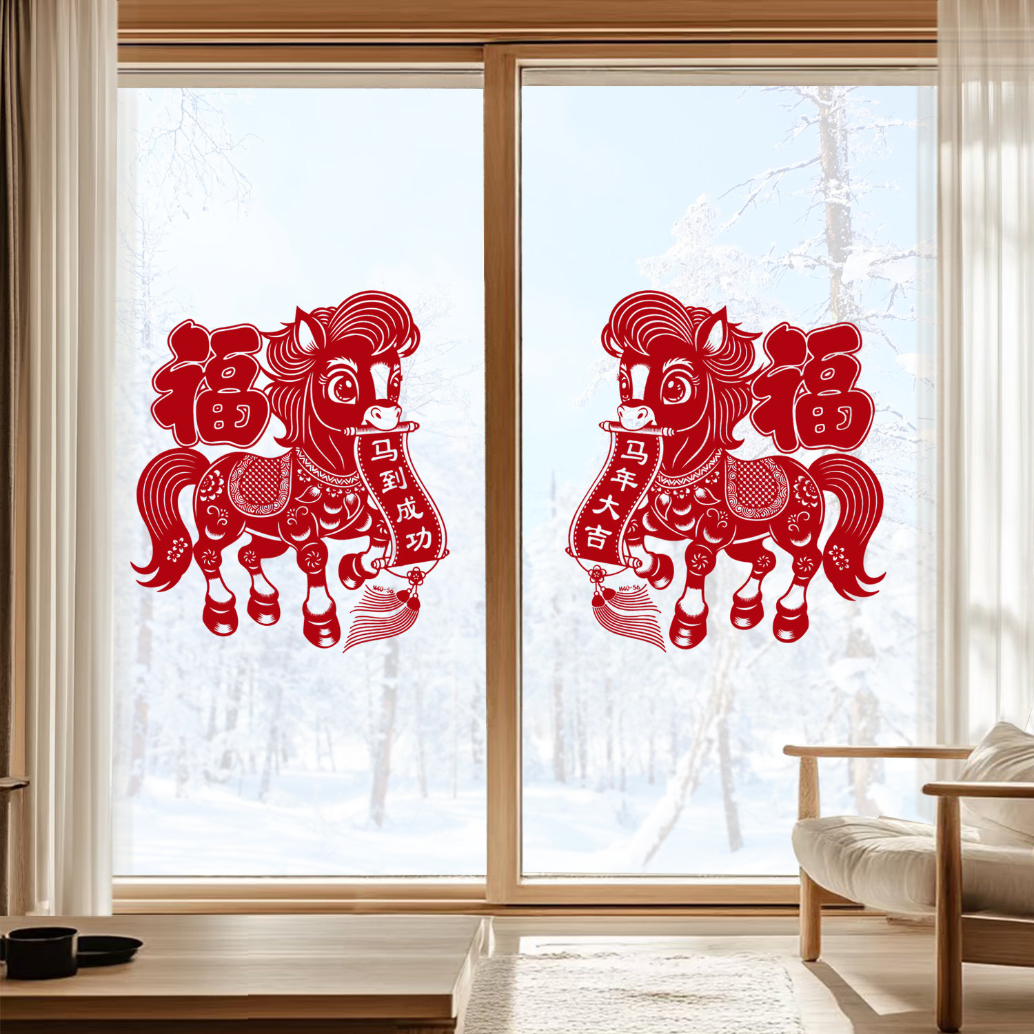 📚 2026马年生肖植绒剪纸窗花静电贴玻璃贴纸过年春节马年装饰门贴画
