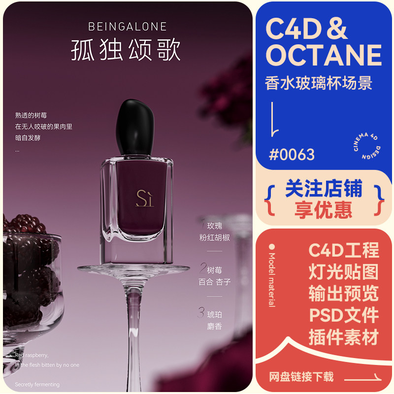 📚 C4D场景建模香水玻璃杯树莓蔓越莓模型简约风格oc渲染工程源文件