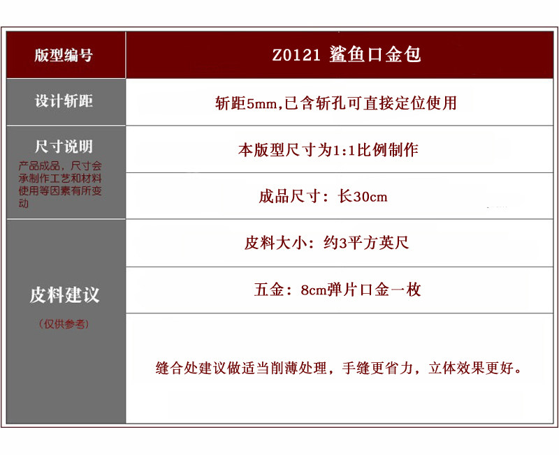📚 Z0121鲨鱼口金包 版型图纸纸样 手工DIY皮革手作皮具 非成品 30cm