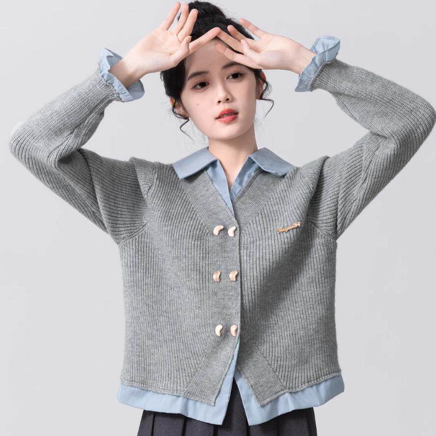📚 正品哥家新2025春新学院风设计感拼接POLO领假两件百搭针织开衫