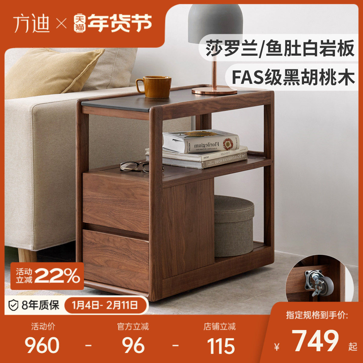 📚 方迪实木沙发边几家用黑胡桃角几客厅可移动岩板茶几小户型窄边桌