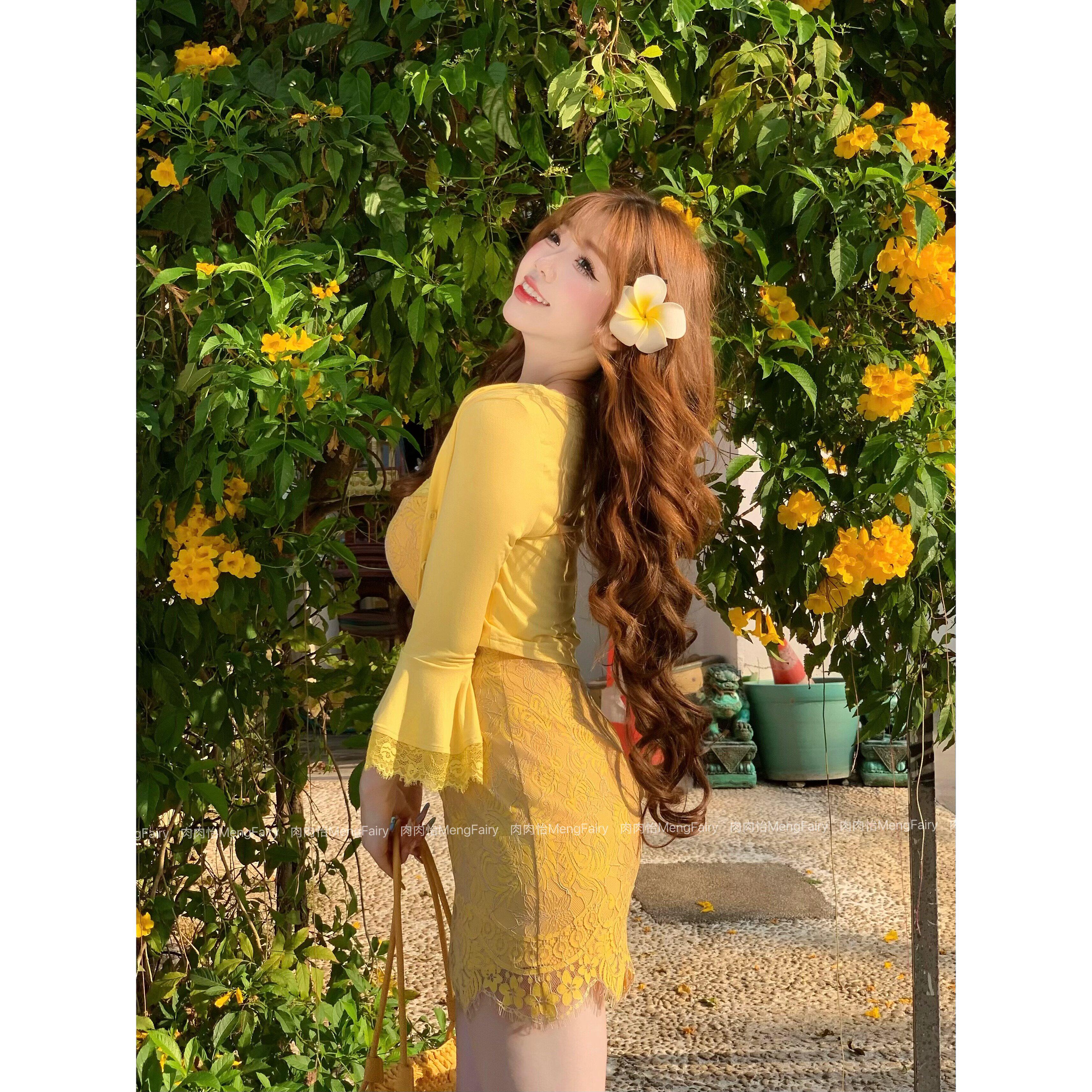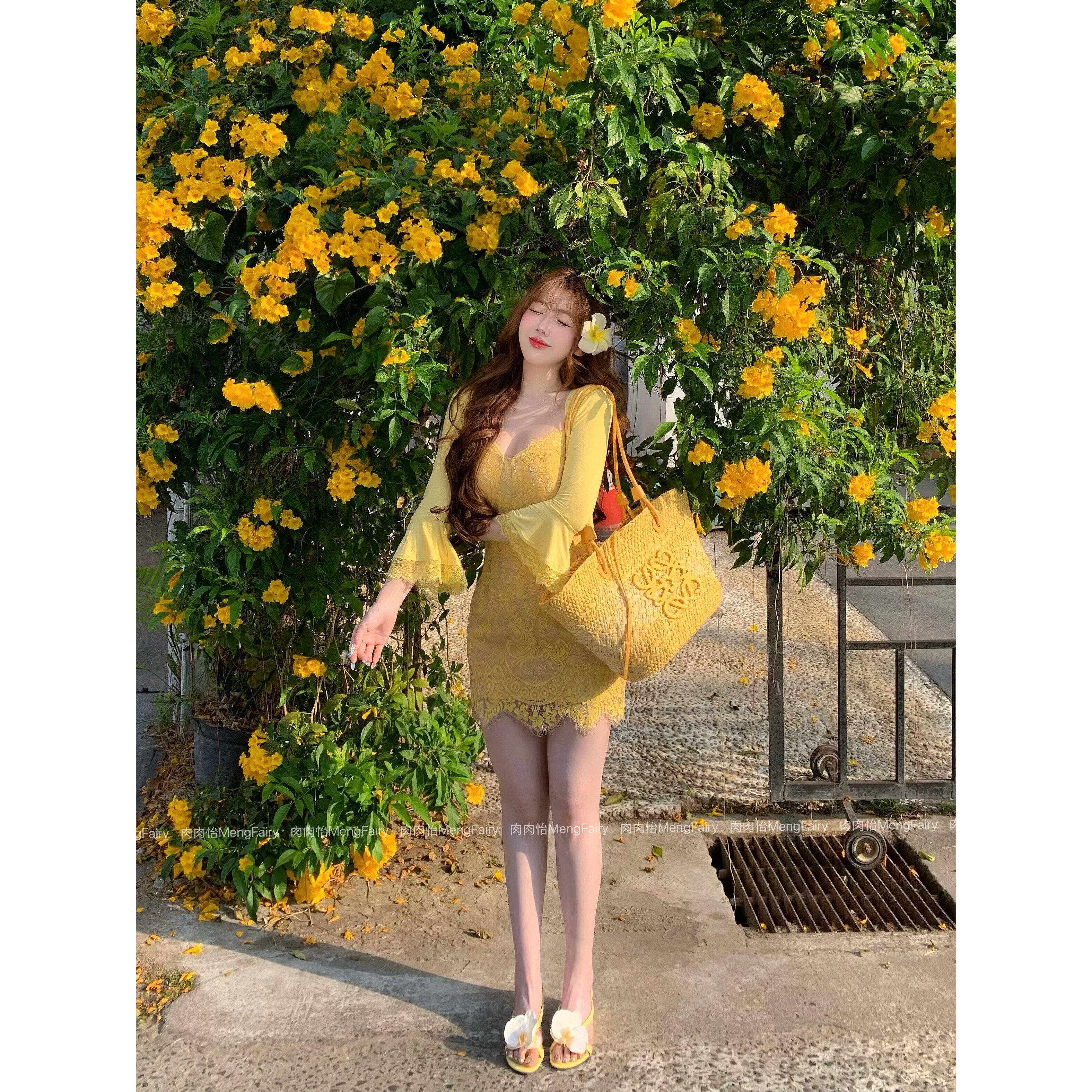 📚 肉肉怡【琥珀佳人】柠檬黄蕾丝V领短款收腰显瘦轻熟吊带裙连衣裙
