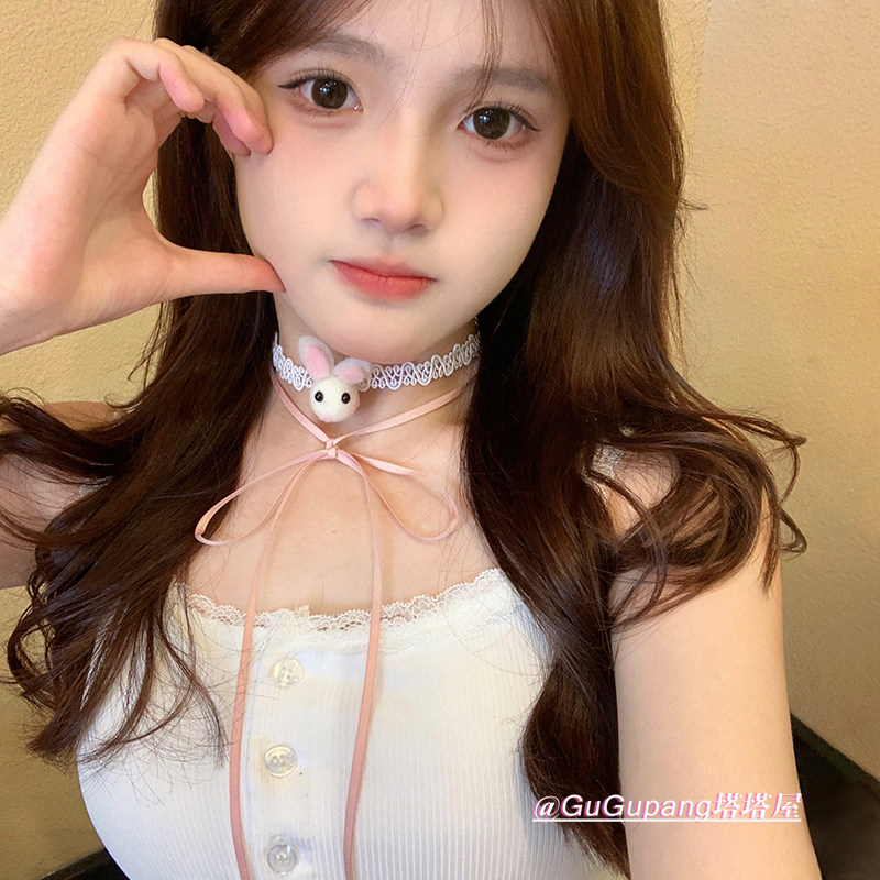 📚 超可爱粉色毛绒小兔子项链纯欲风丝带项圈choker甜酷千禧风锁骨链