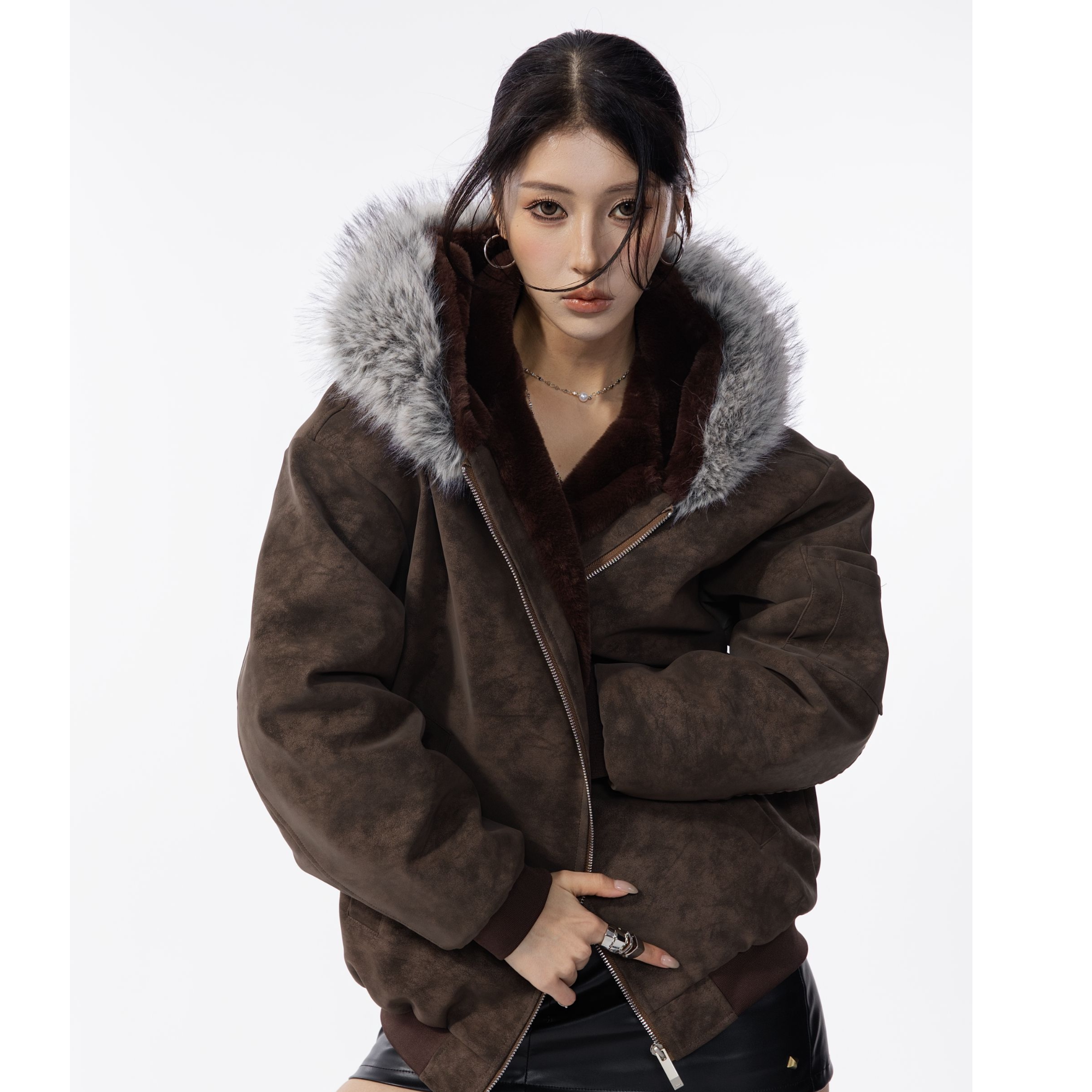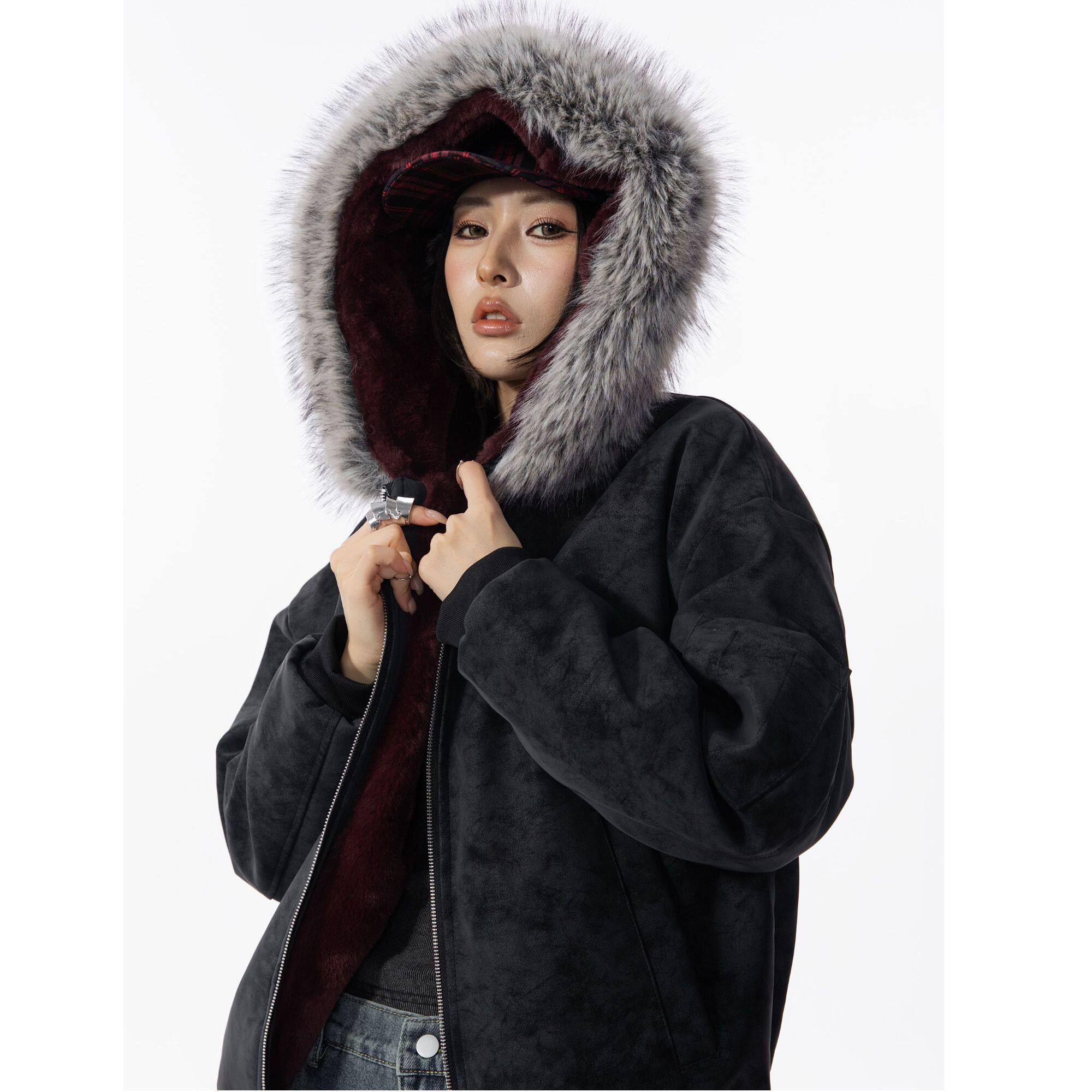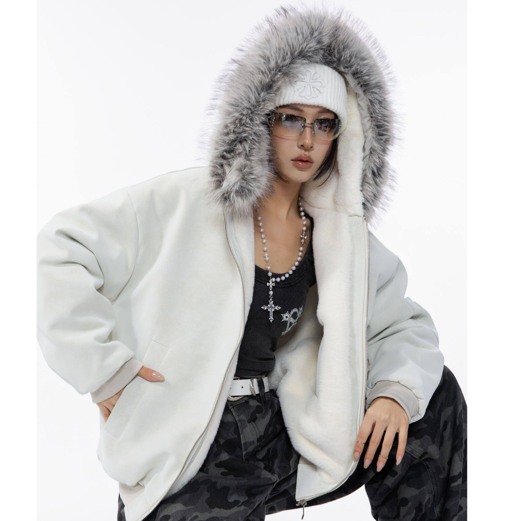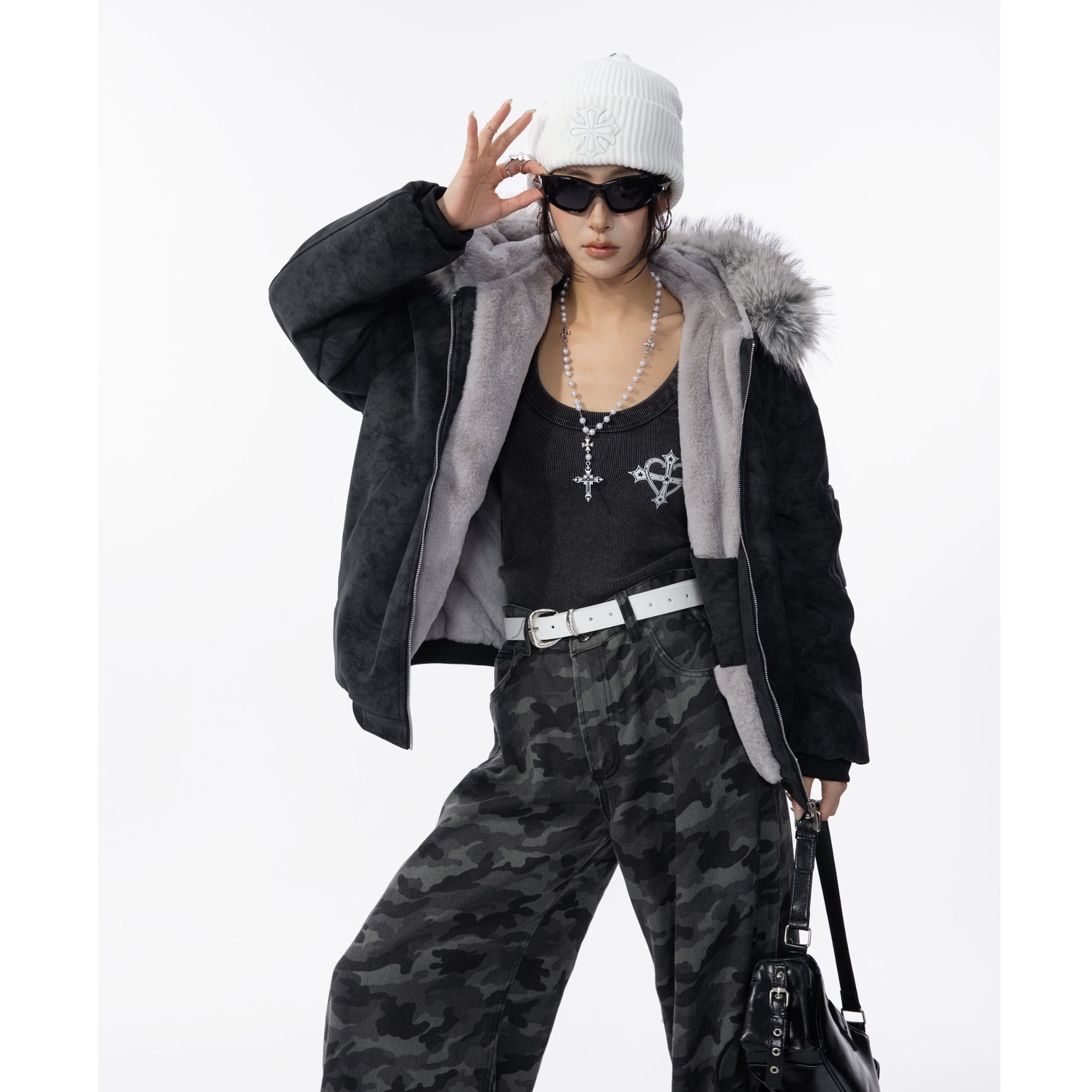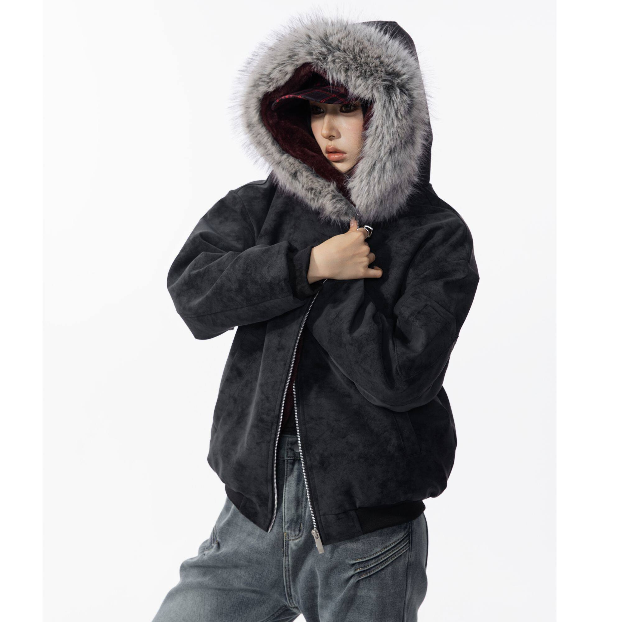 📚 HSNH【可拆卸连帽座山雕外套】PU皮加绒加厚休闲韩版棉服男女同款
