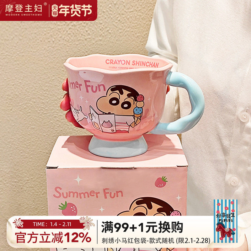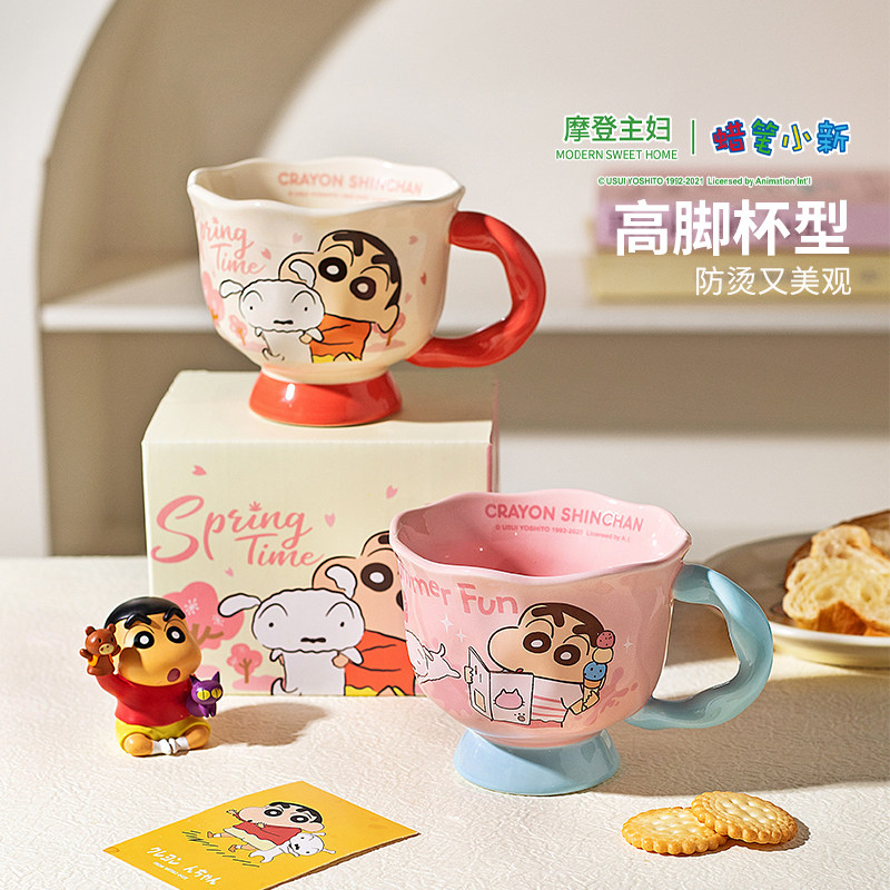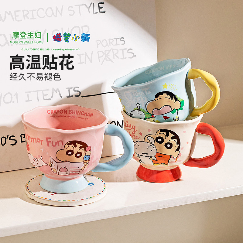 📚 摩登主妇蜡笔小新陶瓷马克杯高脚杯家用水杯早餐杯冲泡杯咖啡杯子