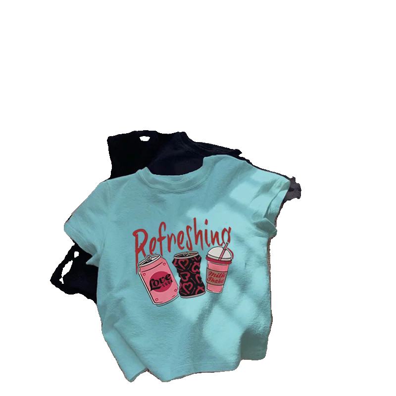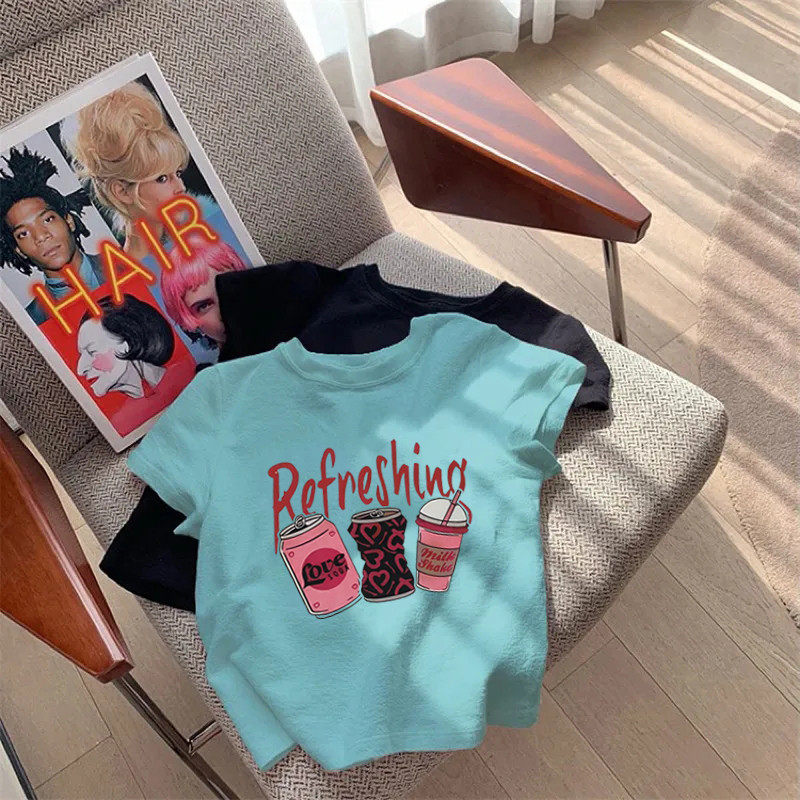 📚 多巴胺辣妹小个子短款修身美式复古正肩印花短袖T恤女设计感上衣