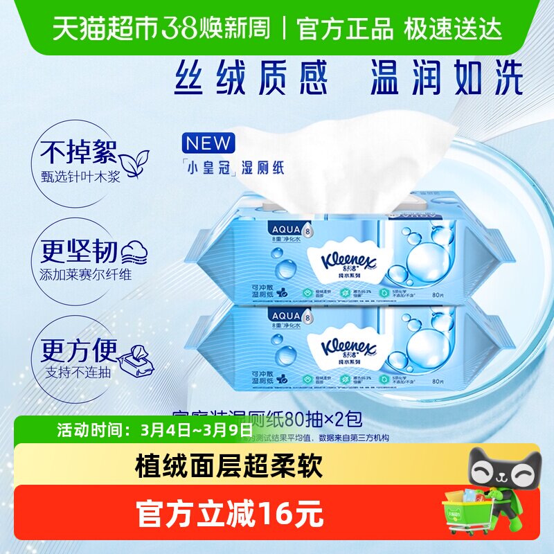 📚 舒洁小皇冠湿厕纸卫生湿纸巾80片*2包可冲马桶洁厕纸擦菌7秒速干