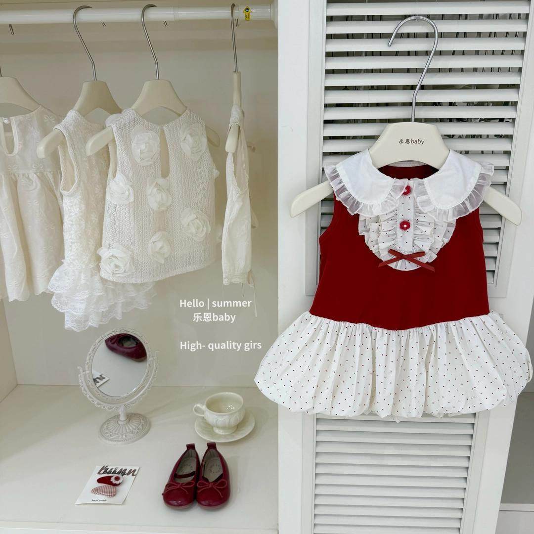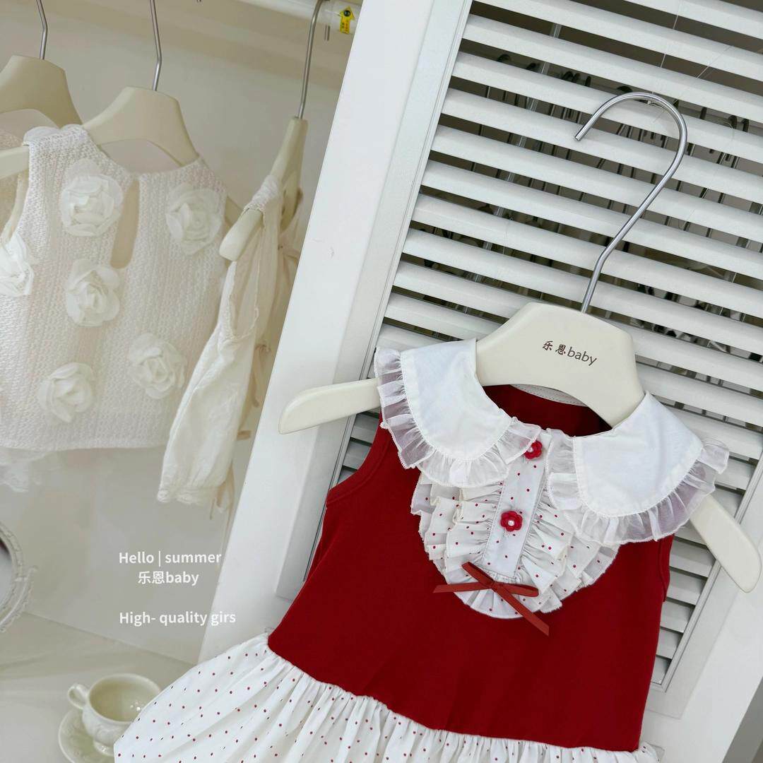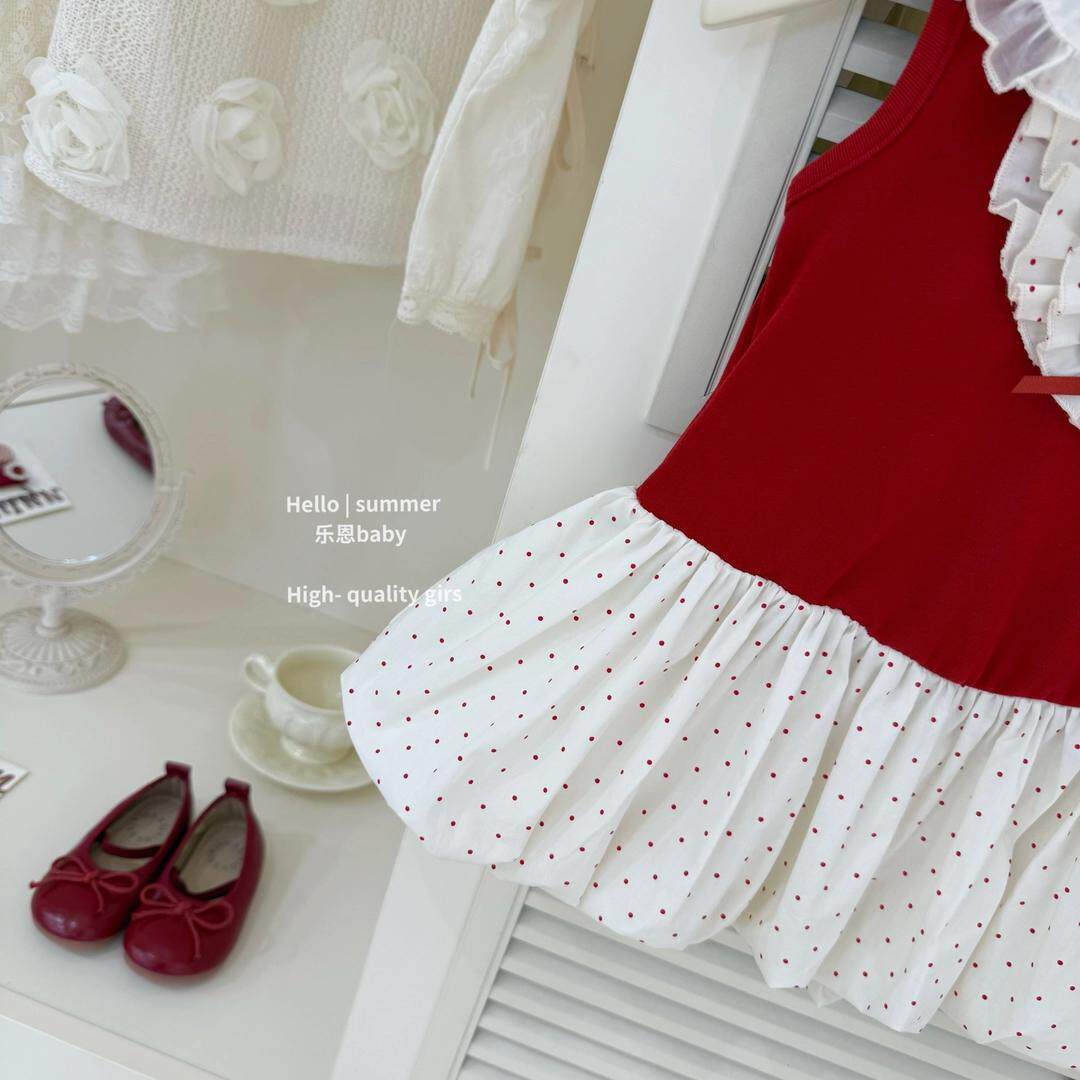 📚 巨显白2026原创女童夏季新款红色拼接波点背心连衣裙公主花苞裙子