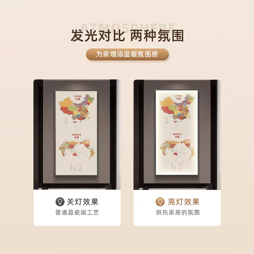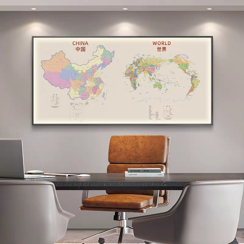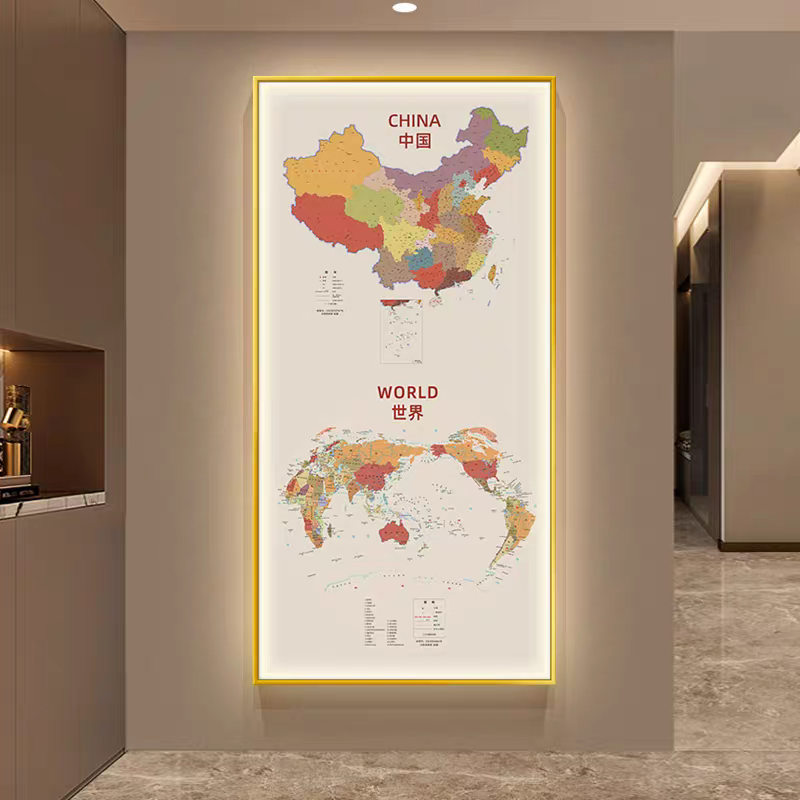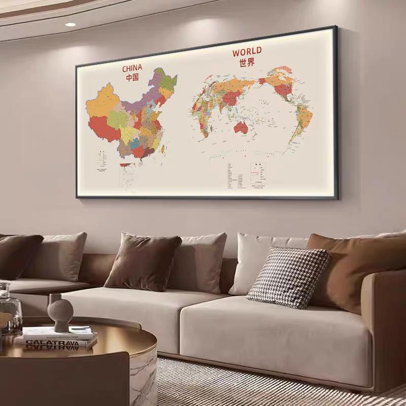📚 世界地图中国LED灯画办公室入户玄关书房横版装饰画客厅会议室画
