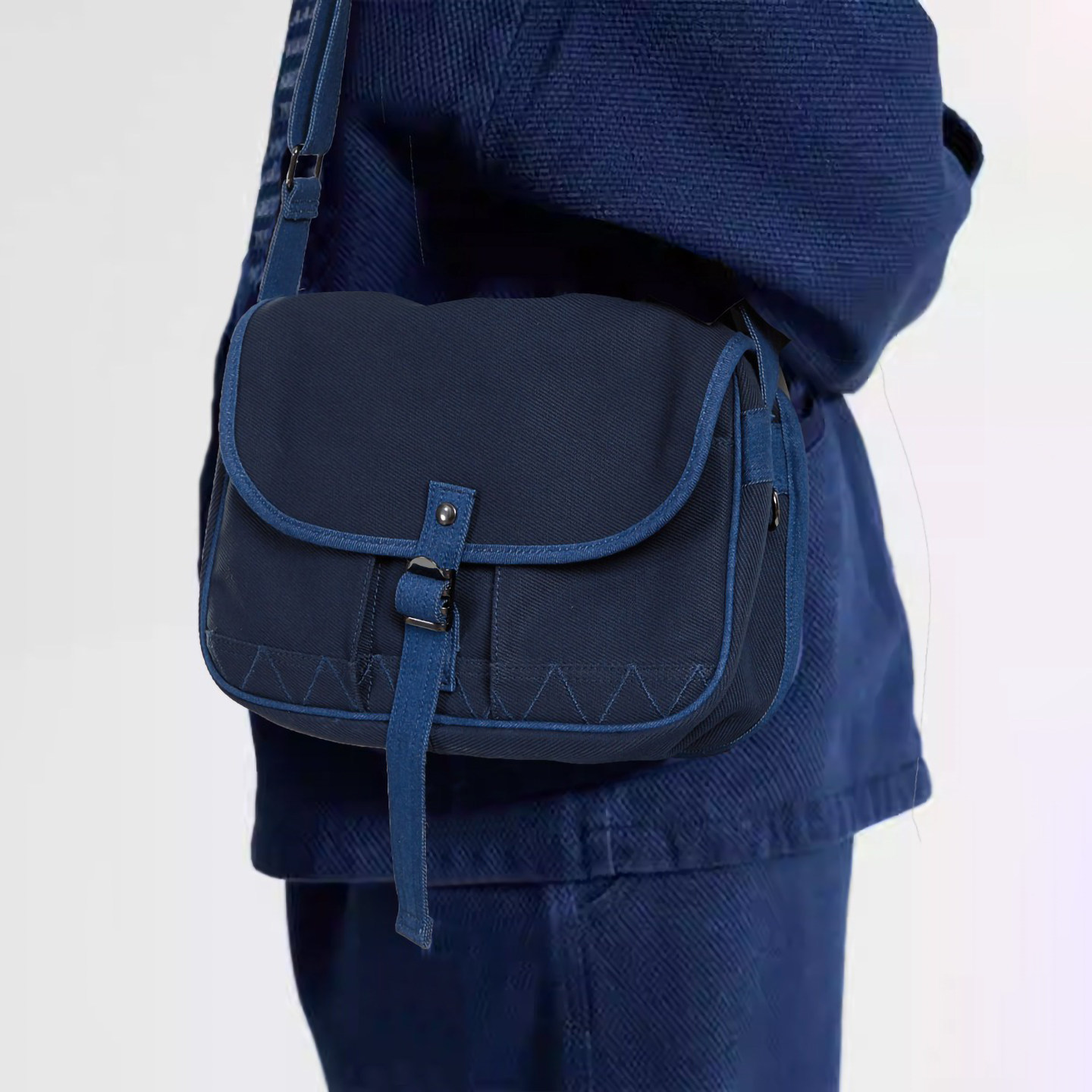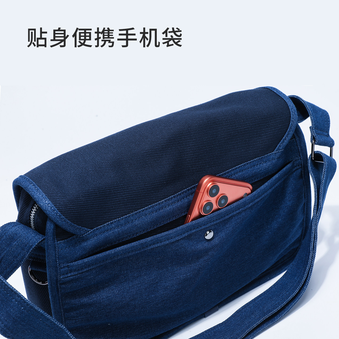 📚 男士斜挎包靛蓝色日系简约通勤工装轻便男包外出大容量单肩帆布包