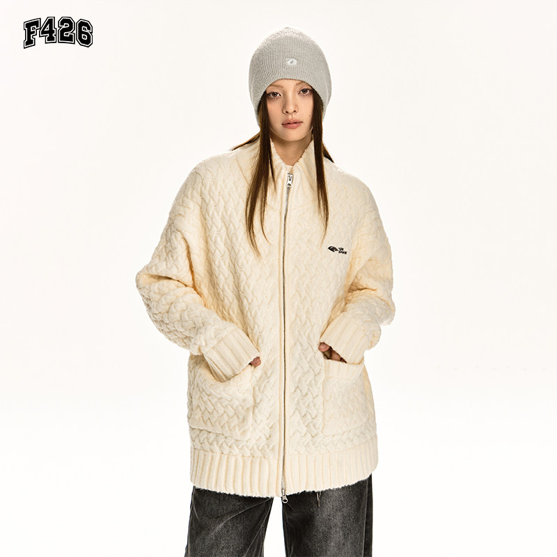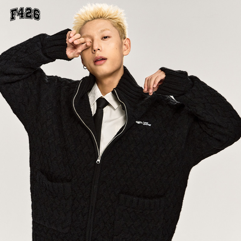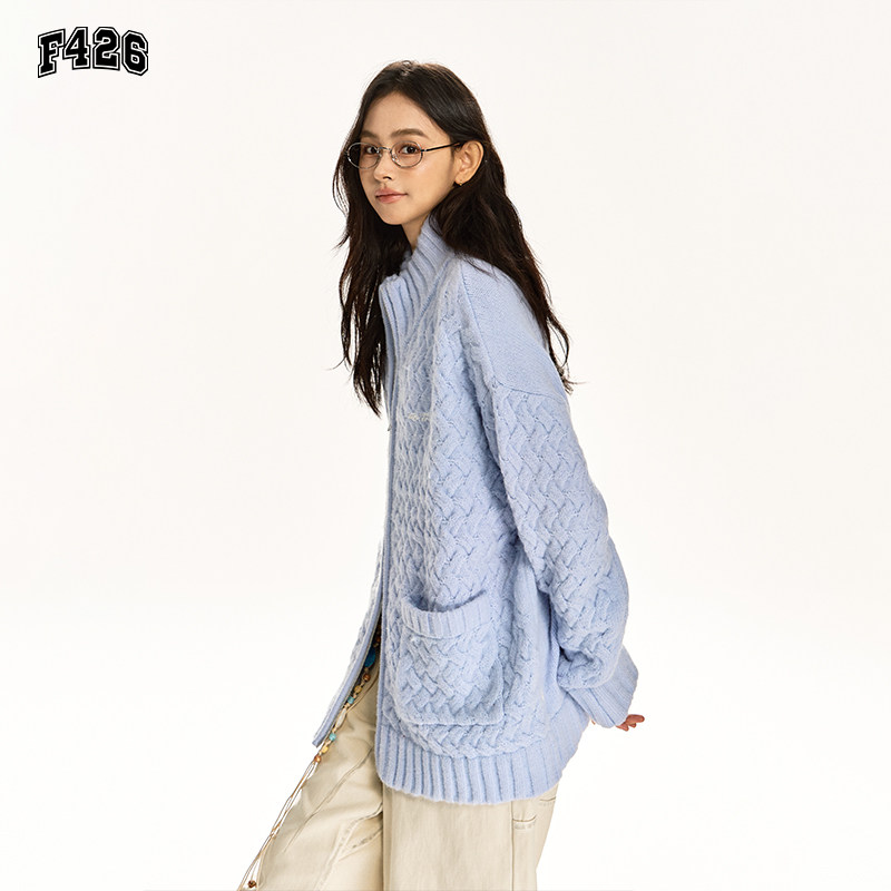 📚 【F426奥莱店】国潮牌情侣春季宽松长袖立领粗棒针开衫毛衣