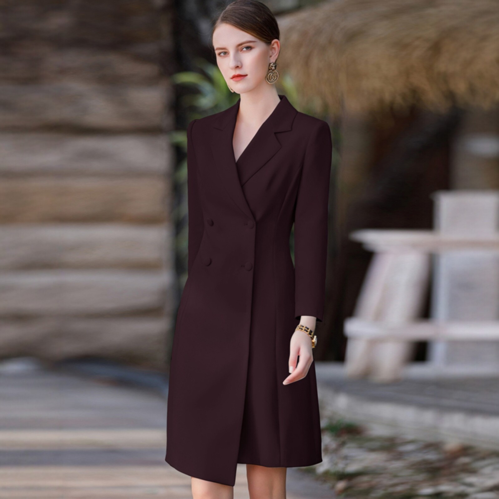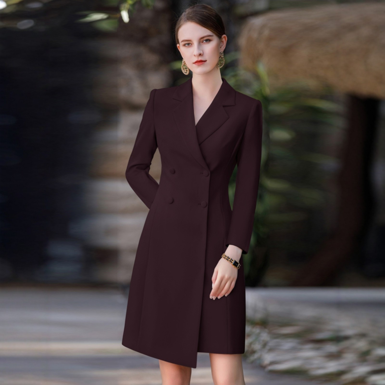 📚 AD大码高端职业连衣裙女时尚深红色中长款长袖工装主持人宴会礼服