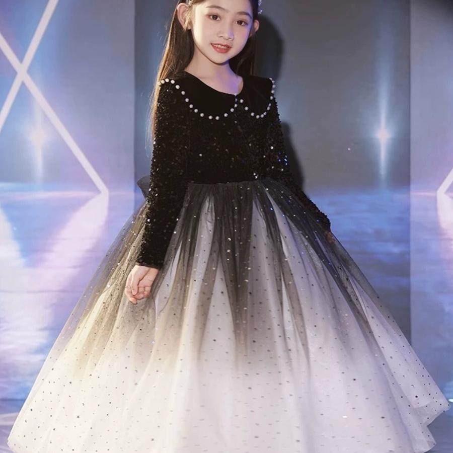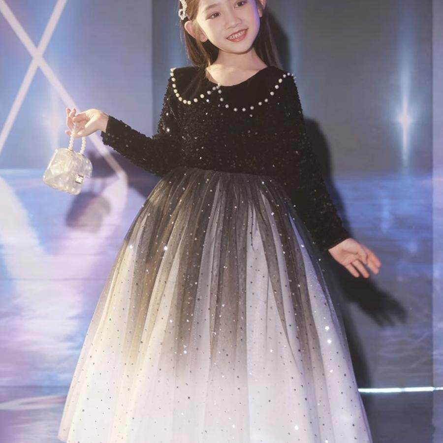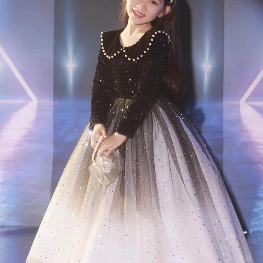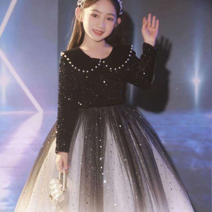 📚 女童黑色礼服轻奢小众高端小主持人加绒长袖公主裙钢琴演奏秋冬季