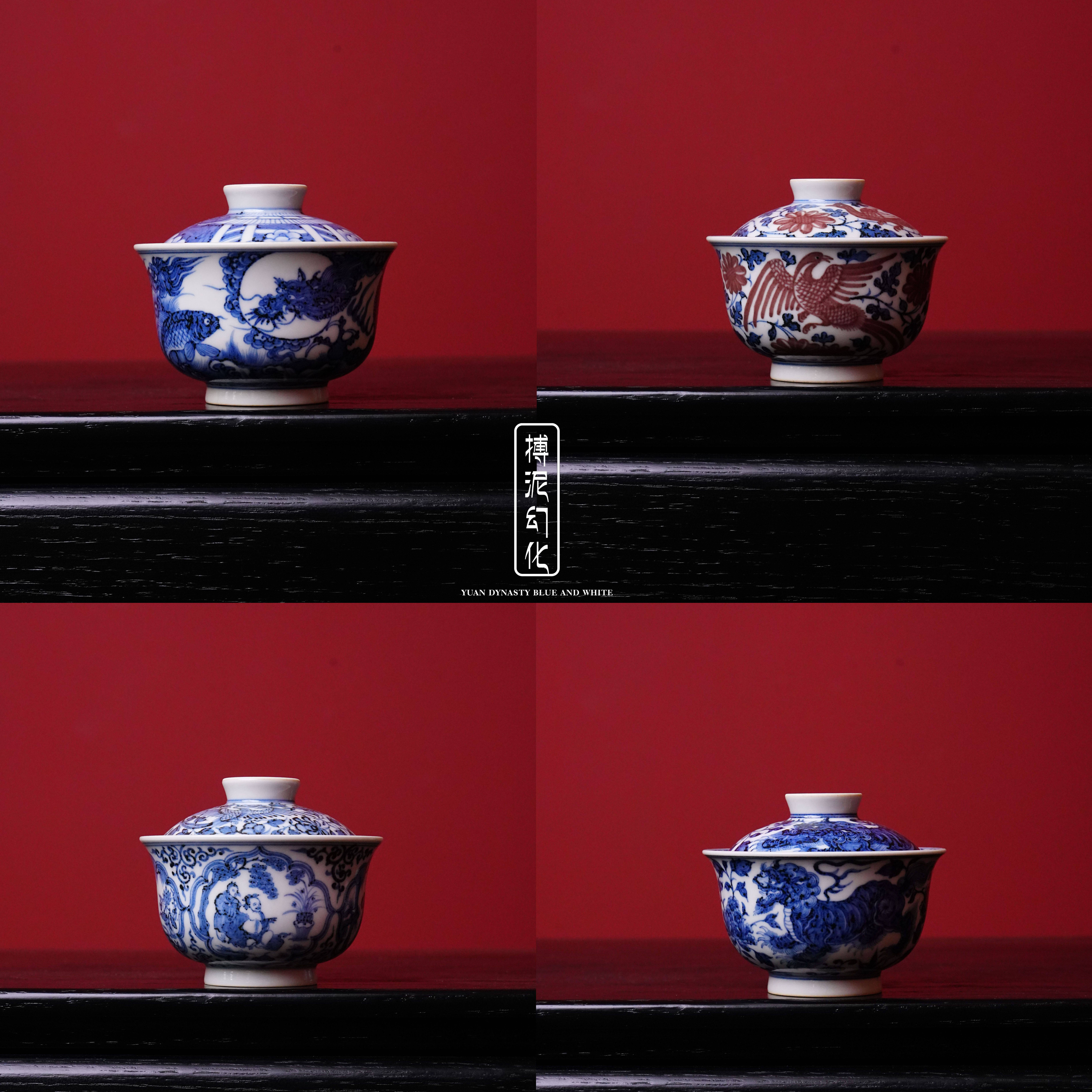 📚 景德镇柴窑元青花搏泥幻化狮子盖碗四爱图盖碗鱼化龙盖碗 釉里红