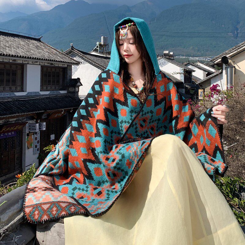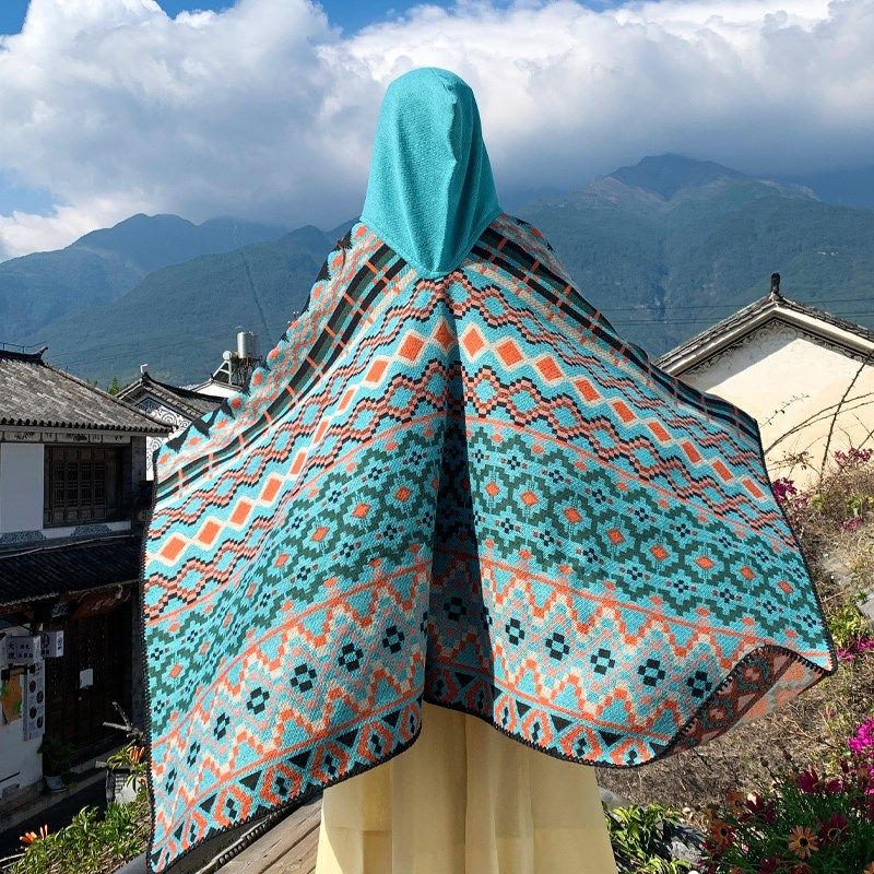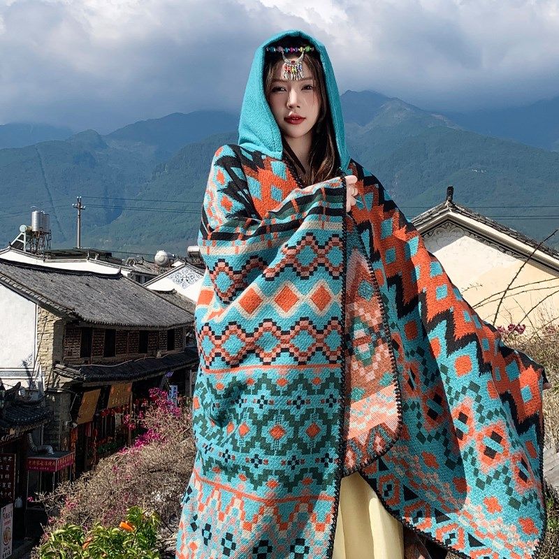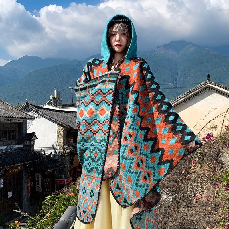 📚 青海西藏云南旅游斗篷披风女秋冬加厚民族风拍照出片超大开叉披肩