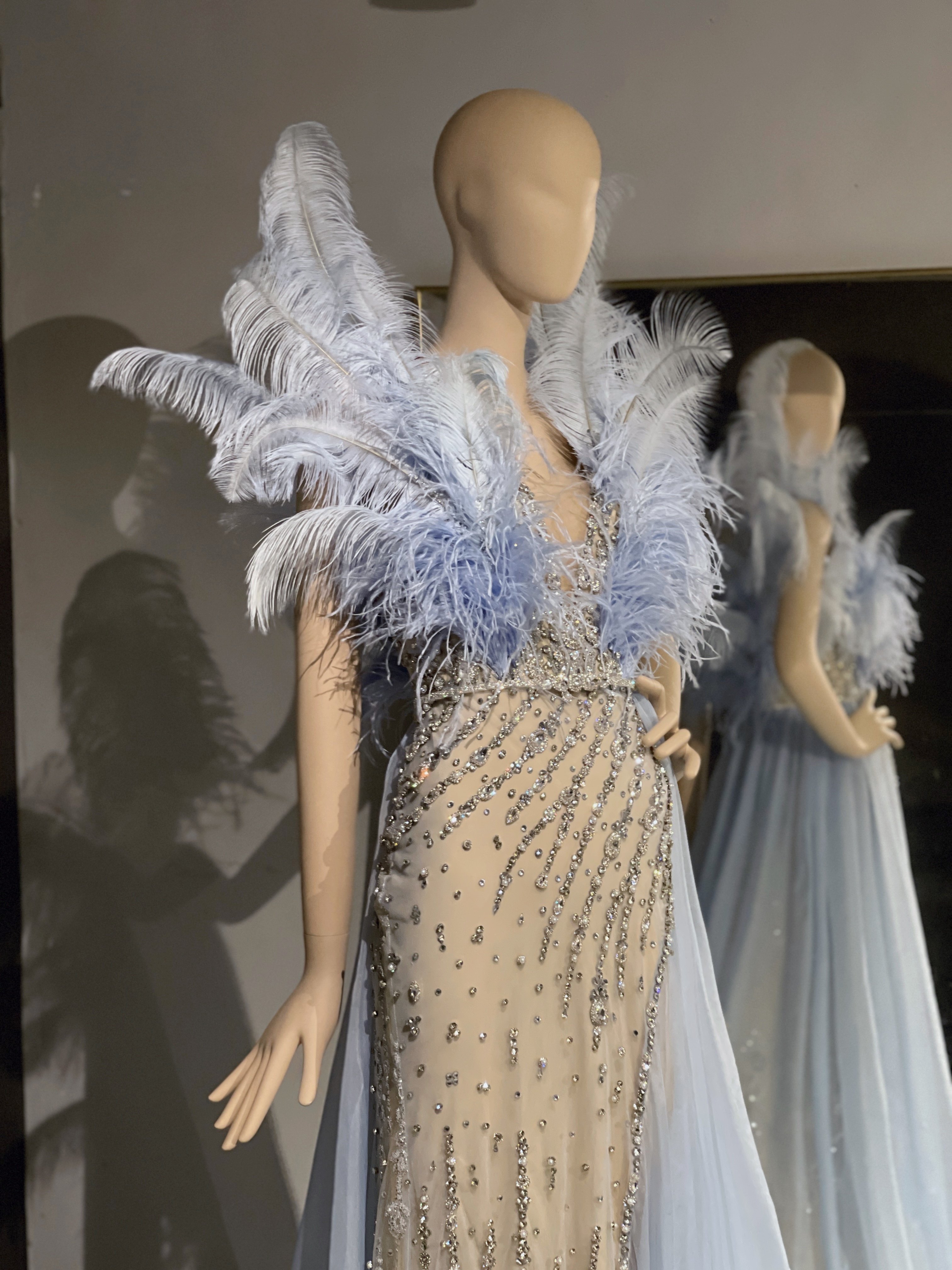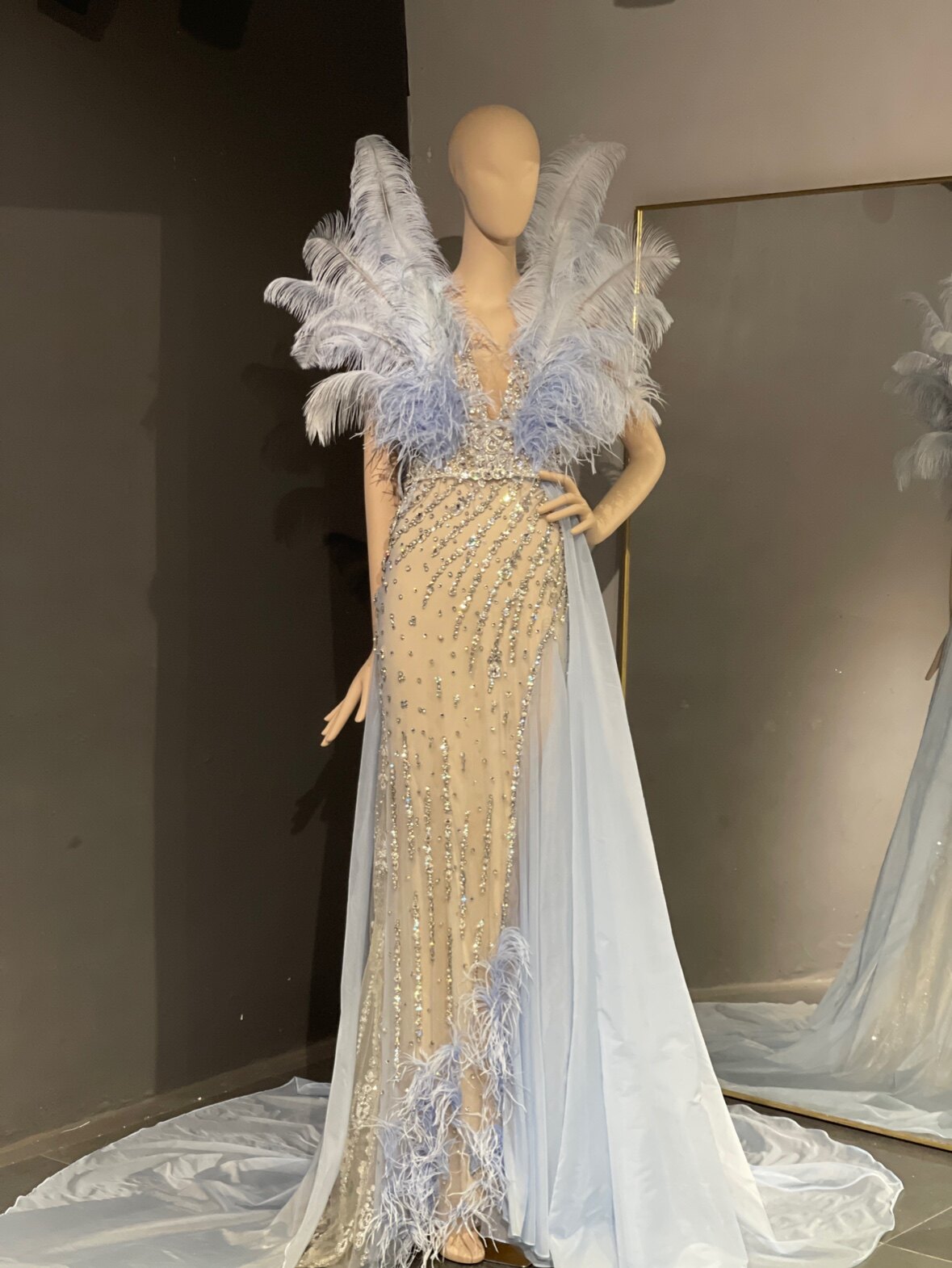 📚 多莉丝租赁新款晚礼服高端法式聚会小众拖尾羽毛一字肩连衣裙