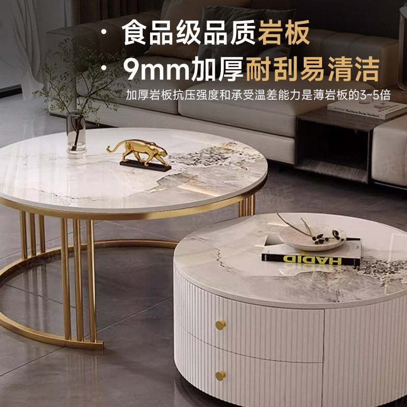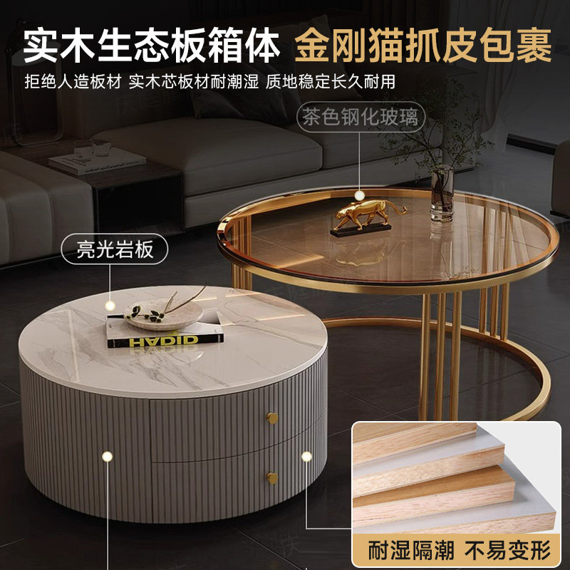 📚 岩板茶几实木客厅家用现代简约新款可伸缩高级感小户型圆形茶桌