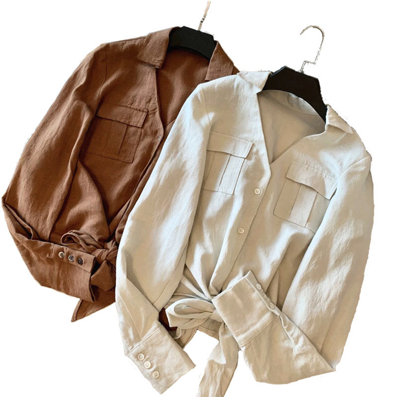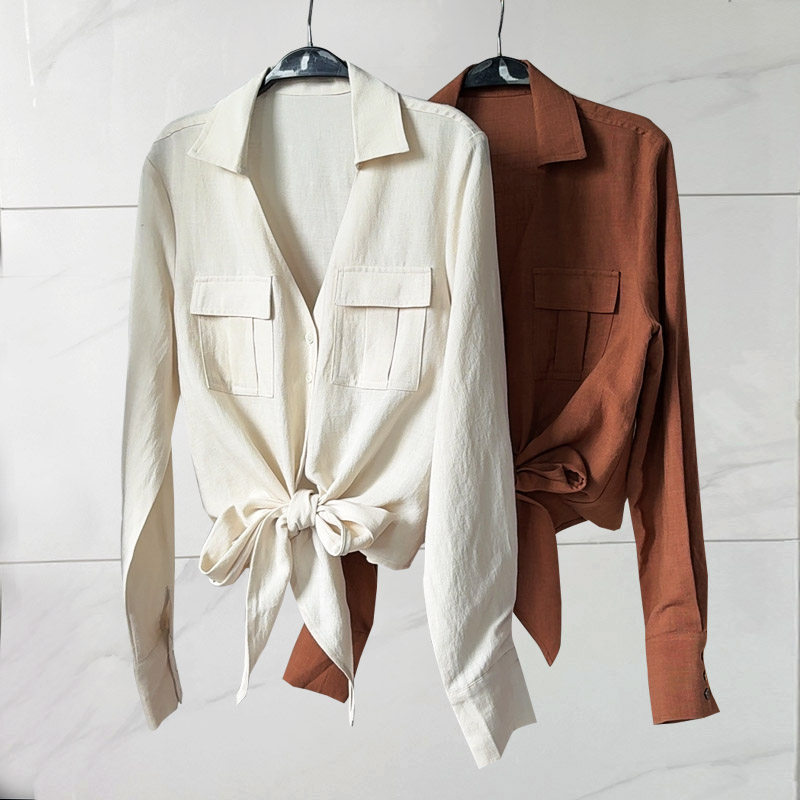 📚 樊樊早安「肤感巨好!!莱赛尔亚麻衬衫」慵懒下摆打结长袖衬衣上衣