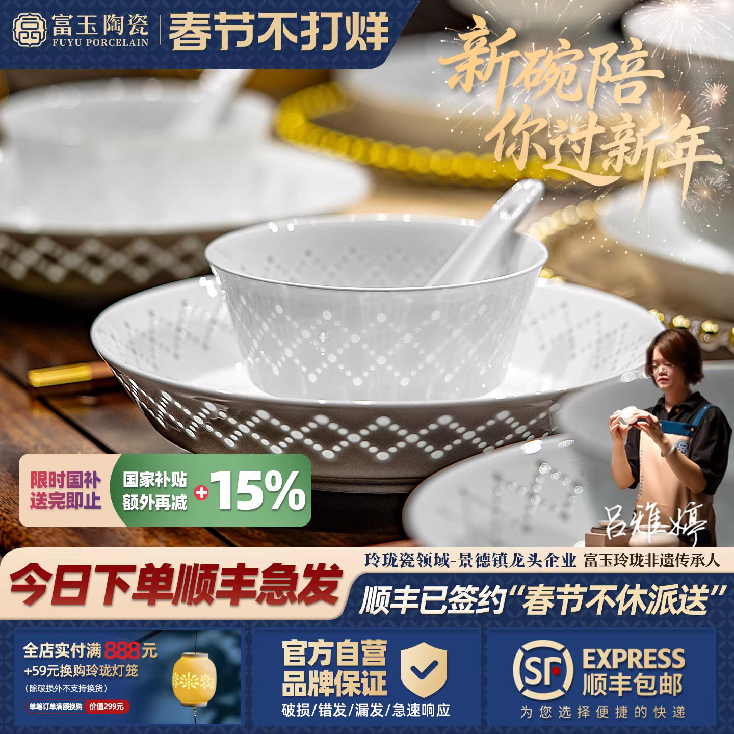 📚 富玉景德镇陶瓷玲珑碗碟餐具套装家用轻奢釉下彩碗盘乔迁送礼盒装