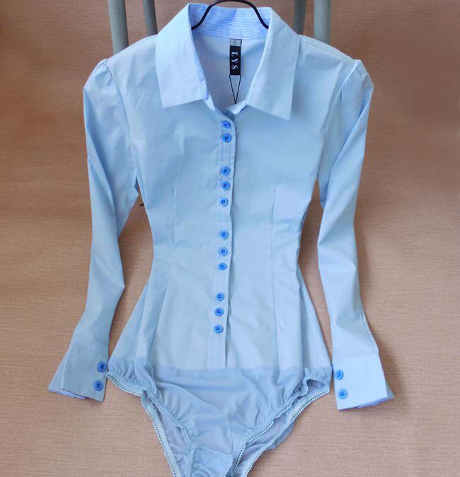 📚 新款 夏装韩版女长袖衬衣短袖蓝白色职业连裆装修身工装连体衬衫