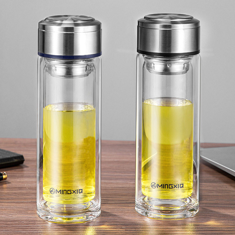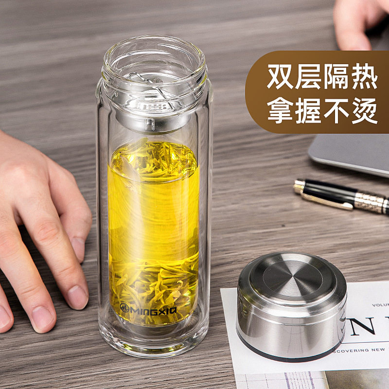 📚 明霞双层玻璃杯办公室水杯家用透明加厚杯子带滤网车载男士泡茶杯