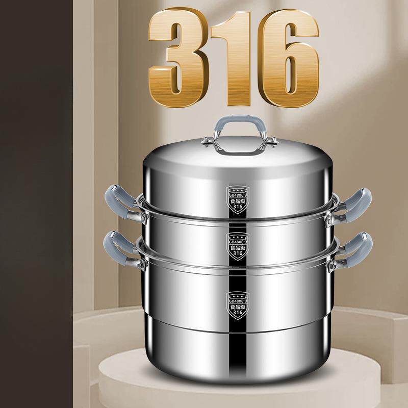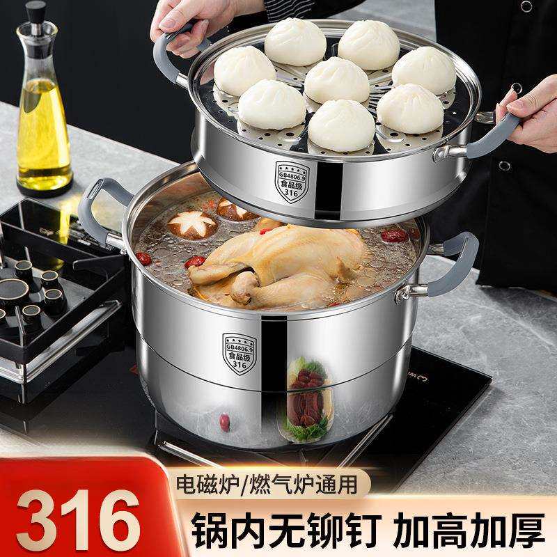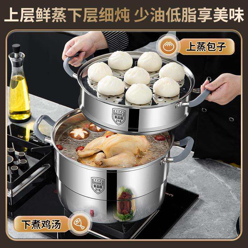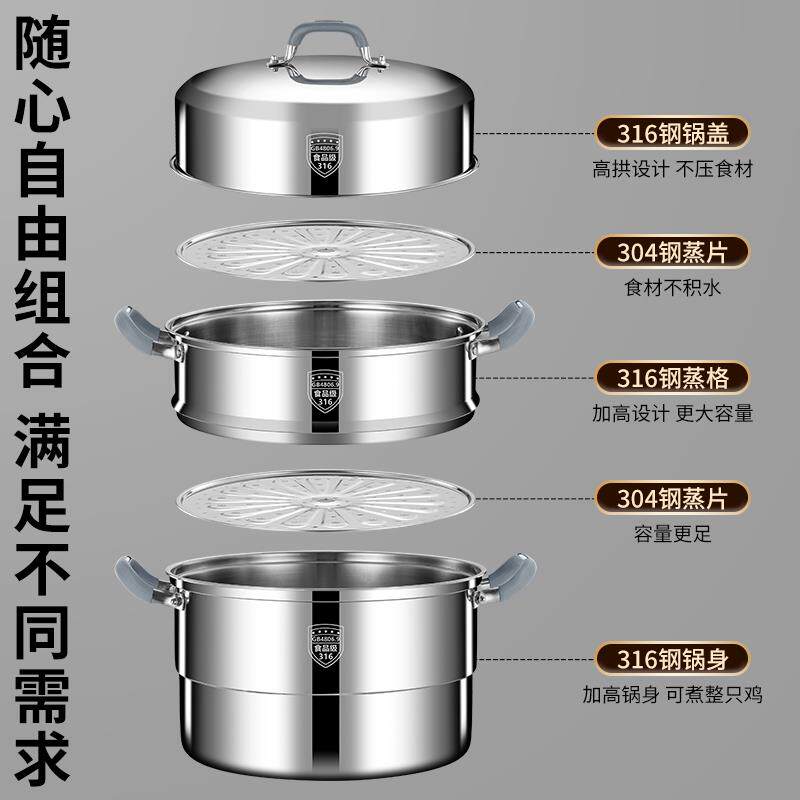 📚 帝乐派食品级316不锈钢蒸锅家用三层双四层蒸笼一体成型蒸馒头锅