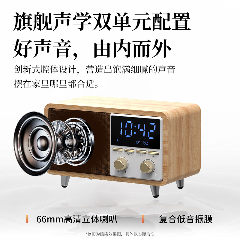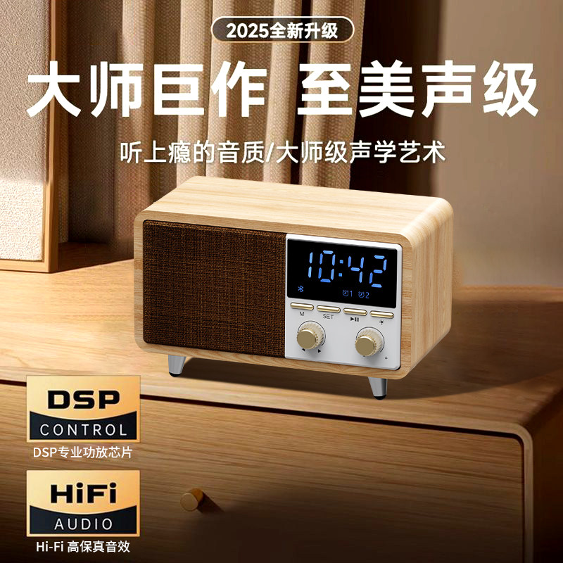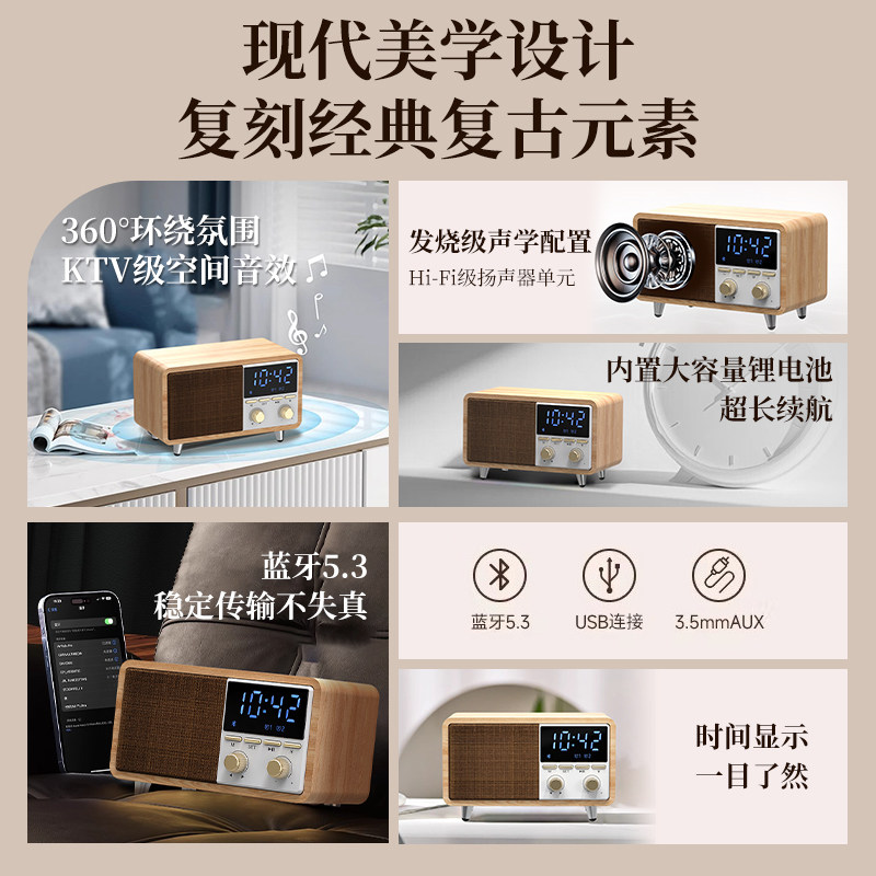 📚 HiFi复古音箱木质无线蓝牙低音炮环绕立体声桌面时钟音响超长续航
