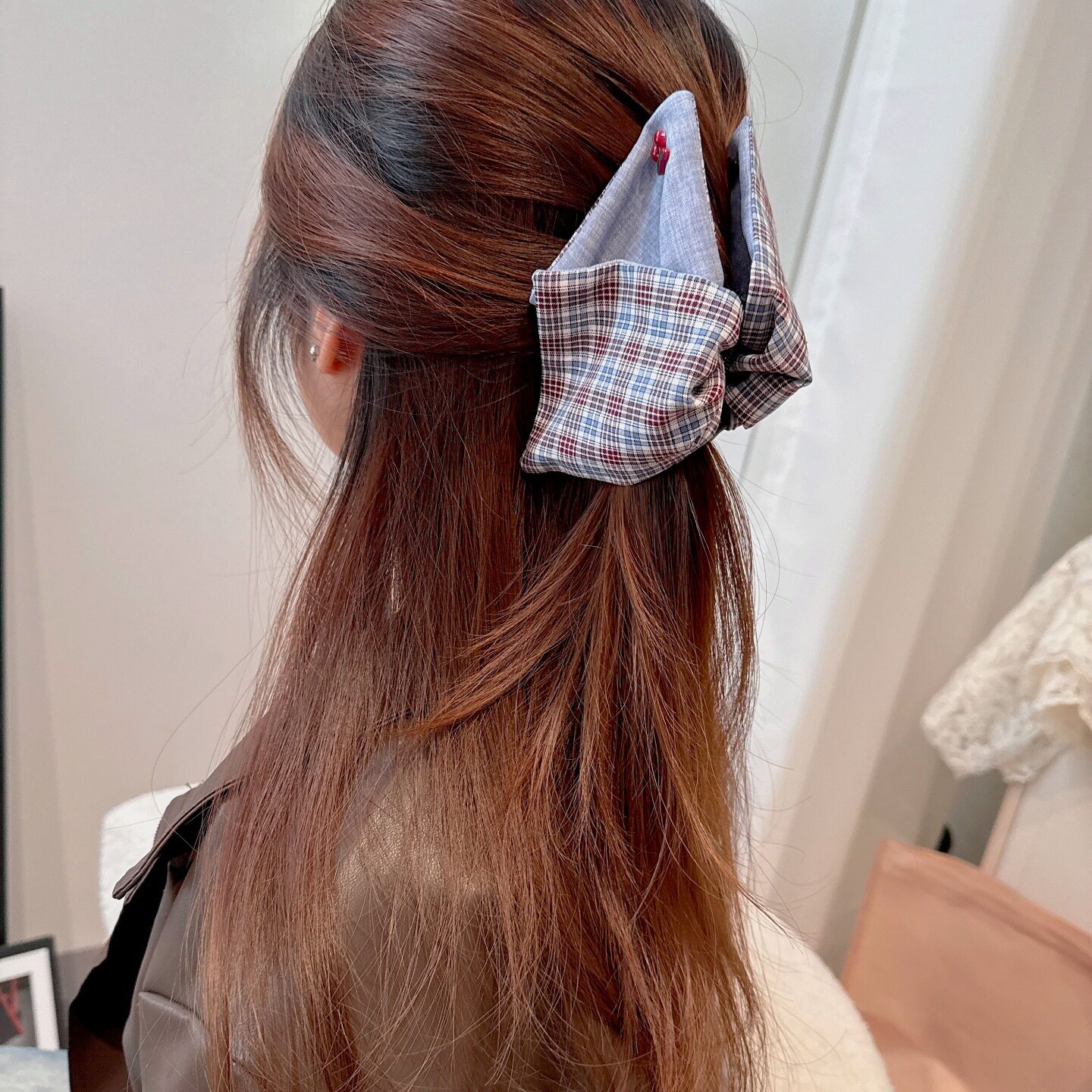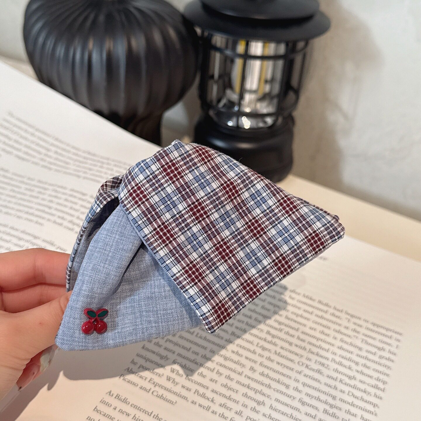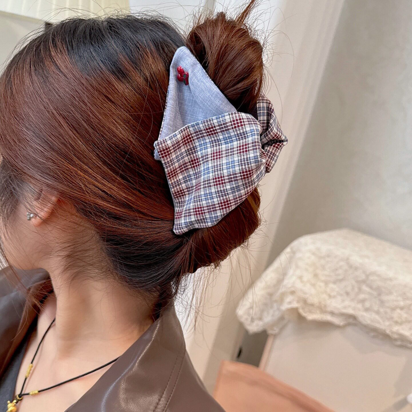 📚 韩系复古牛仔格纹樱桃三角抓夹女盘发后脑勺抓夹高级感鲨鱼夹发饰